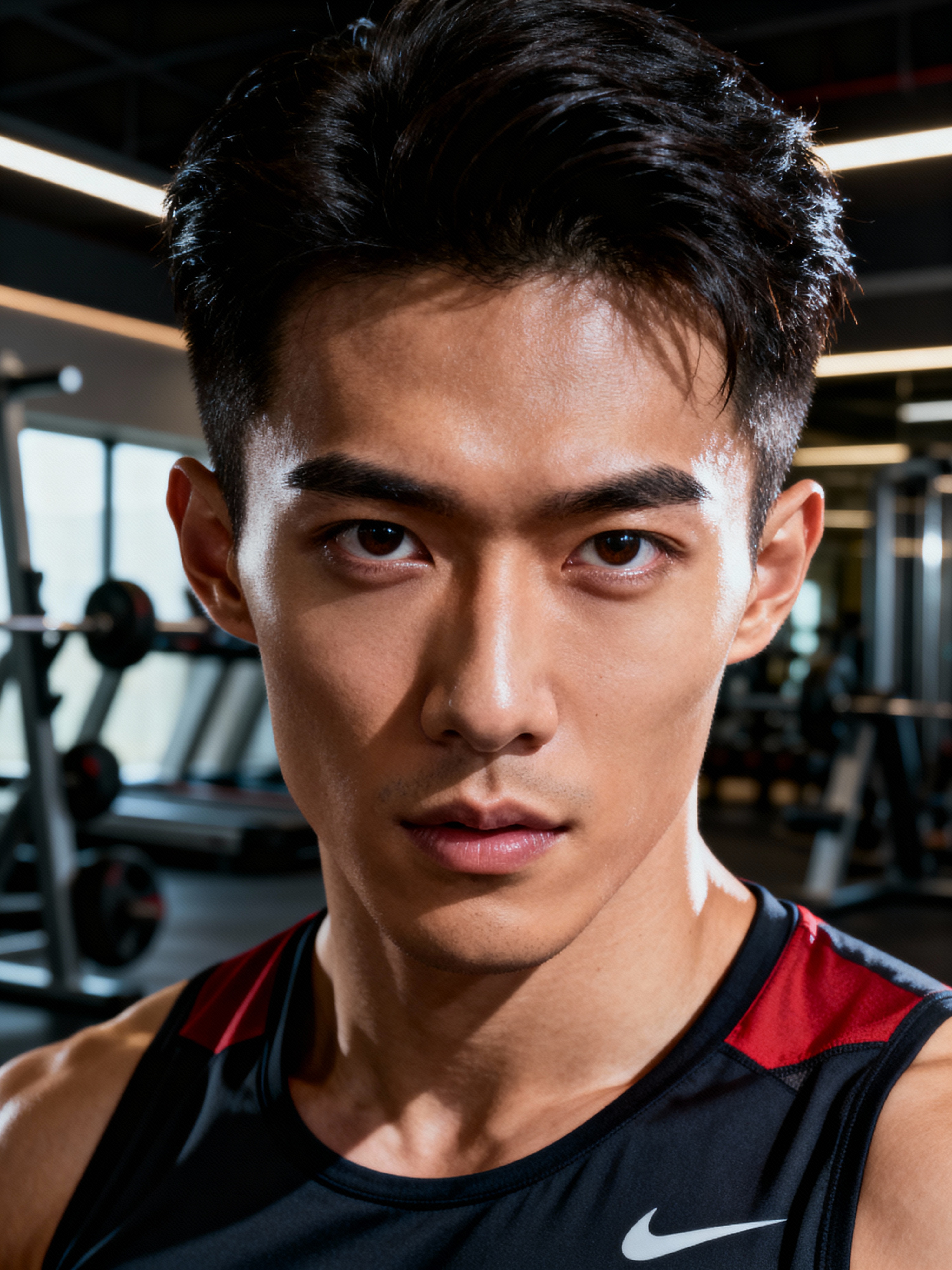insanely beautiful model in a fitness campaign. Wearing luxury sportswear, dynamic stance. Modern gym setting, fitness photography.
