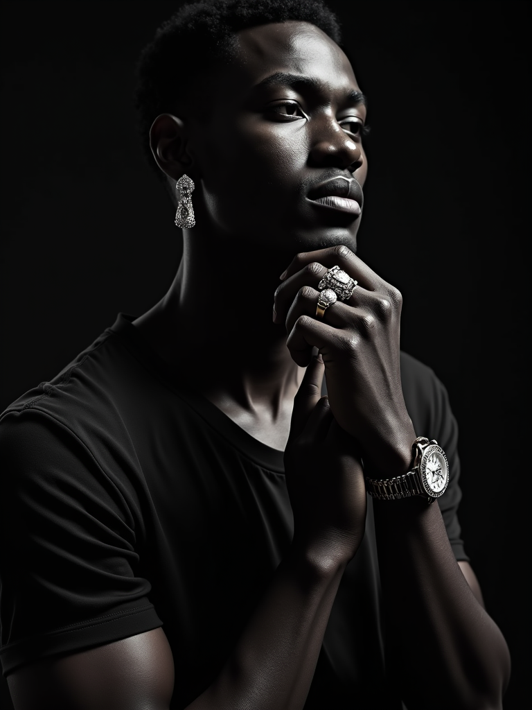 insanely beautiful model in a high-end jewelry campaign. Wearing luxury timepieces, sophisticated stance. Dramatic lighting, luxury product photography.