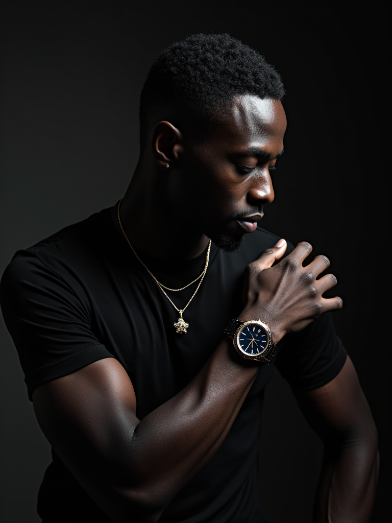 insanely beautiful model in a high-end jewelry campaign. Wearing luxury timepieces, sophisticated stance. Dramatic lighting, luxury product photography.