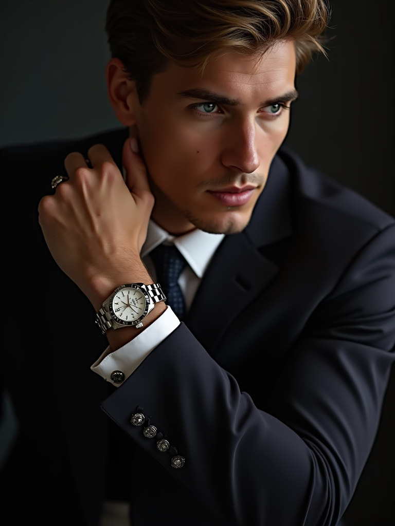 insanely beautiful model in a high-end jewelry campaign. Wearing luxury timepieces, sophisticated stance. Dramatic lighting, luxury product photography.