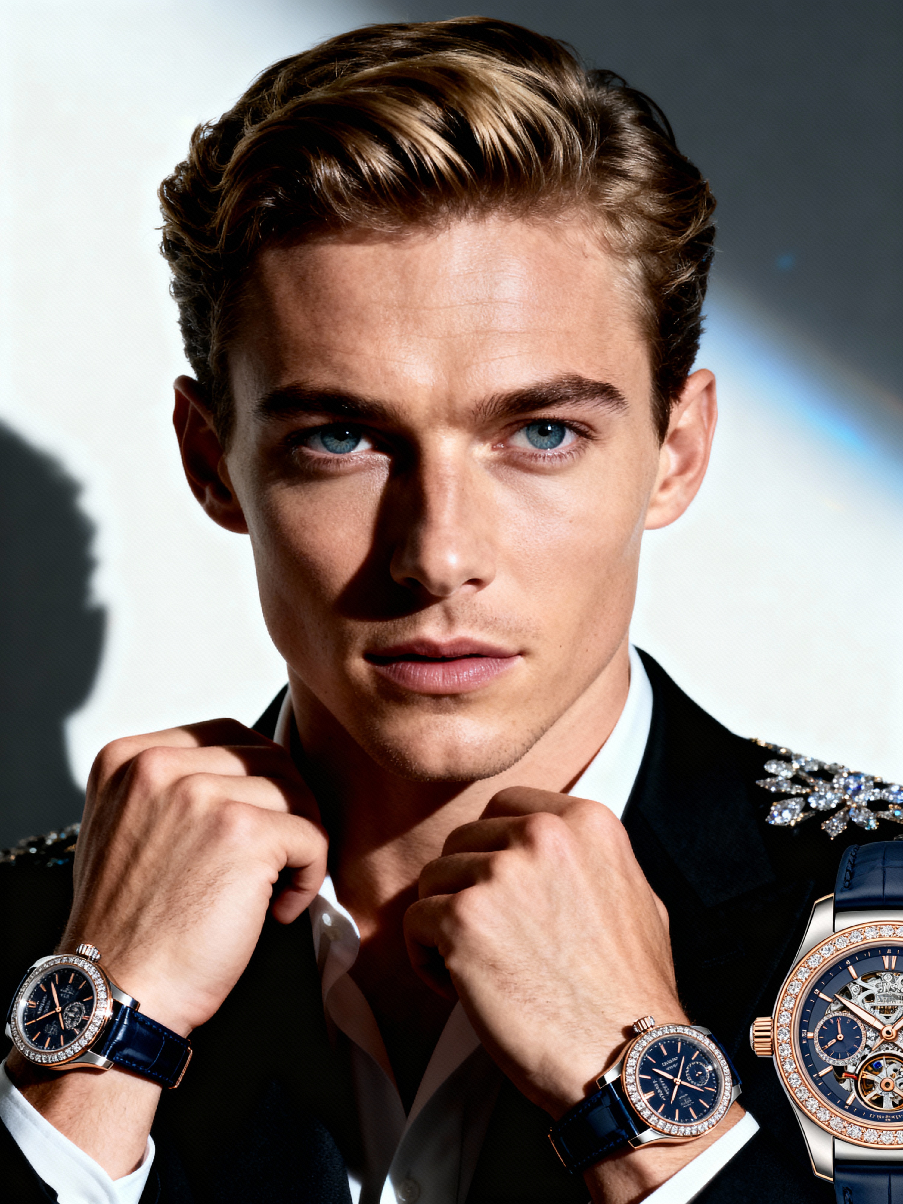 insanely beautiful model in a high-end jewelry campaign. Wearing luxury timepieces, sophisticated stance. Dramatic lighting, luxury product photography.
