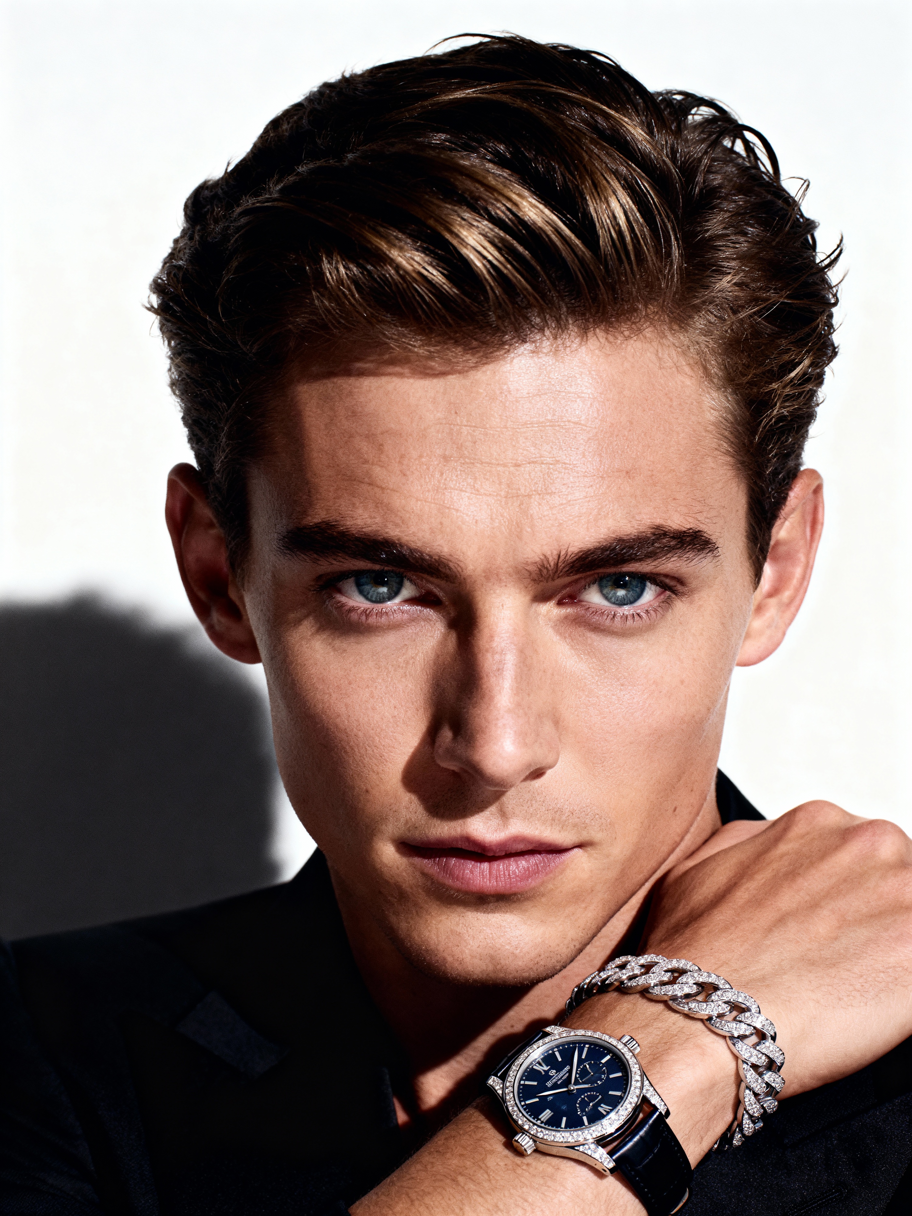 insanely beautiful model in a high-end jewelry campaign. Wearing luxury timepieces, sophisticated stance. Dramatic lighting, luxury product photography.