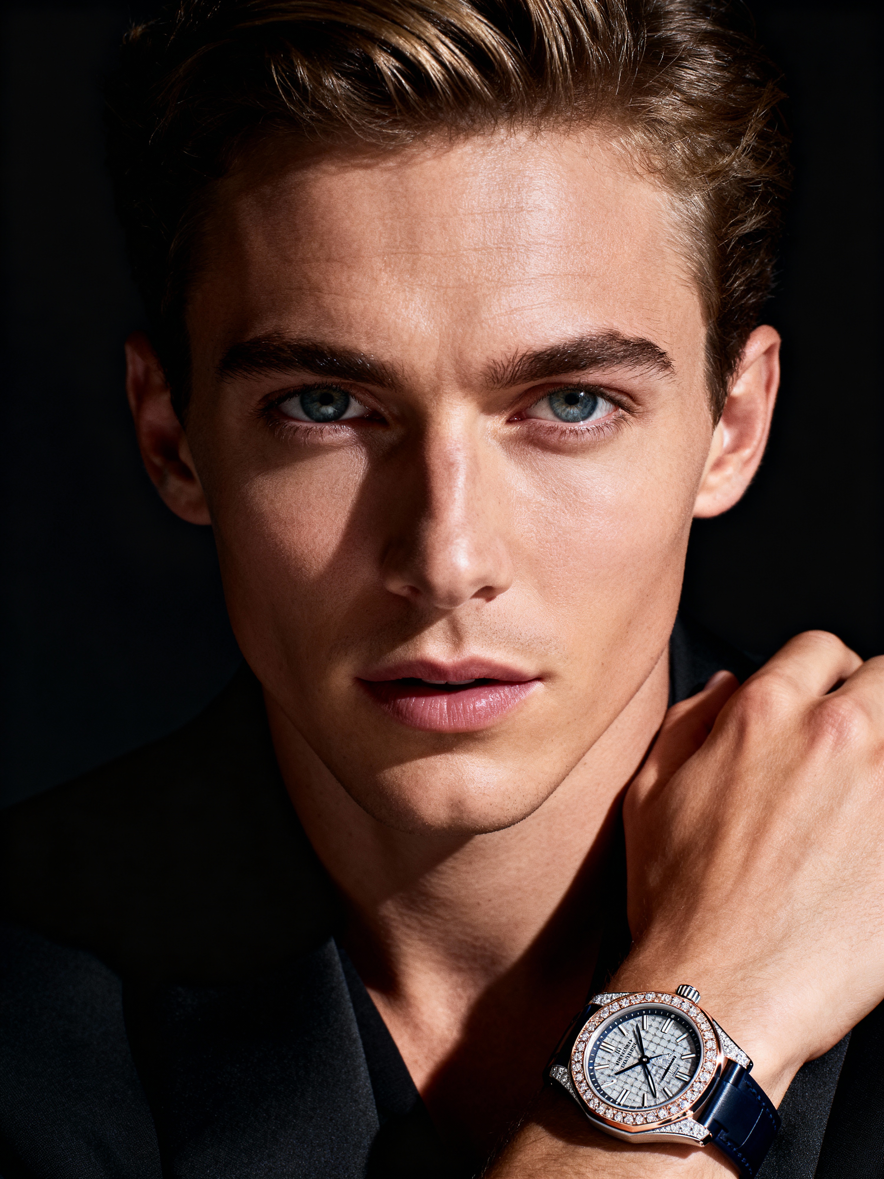 insanely beautiful model in a high-end jewelry campaign. Wearing luxury timepieces, sophisticated stance. Dramatic lighting, luxury product photography.