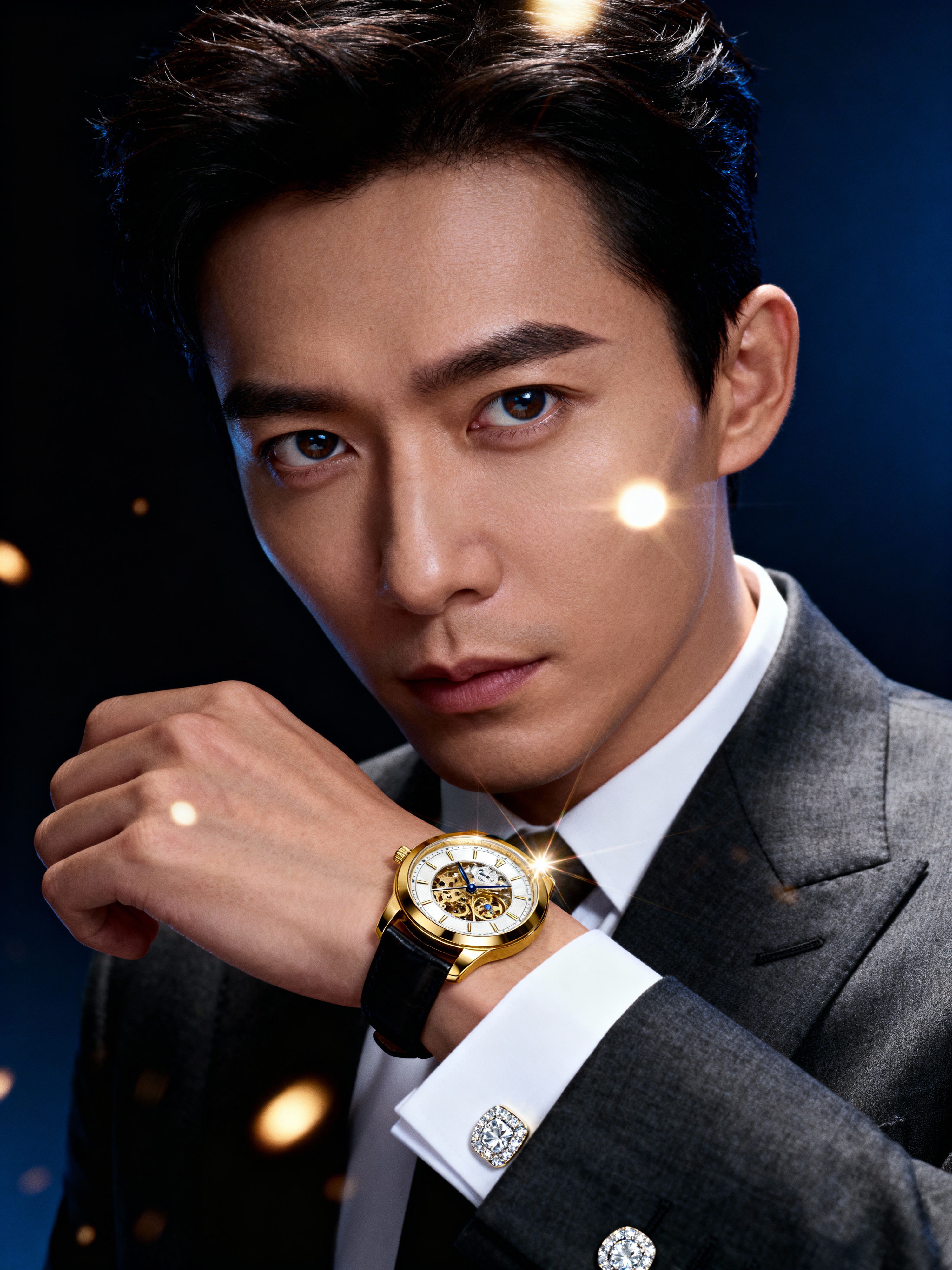 insanely beautiful model in a high-end jewelry campaign. Wearing luxury timepieces, sophisticated stance. Dramatic lighting, luxury product photography.