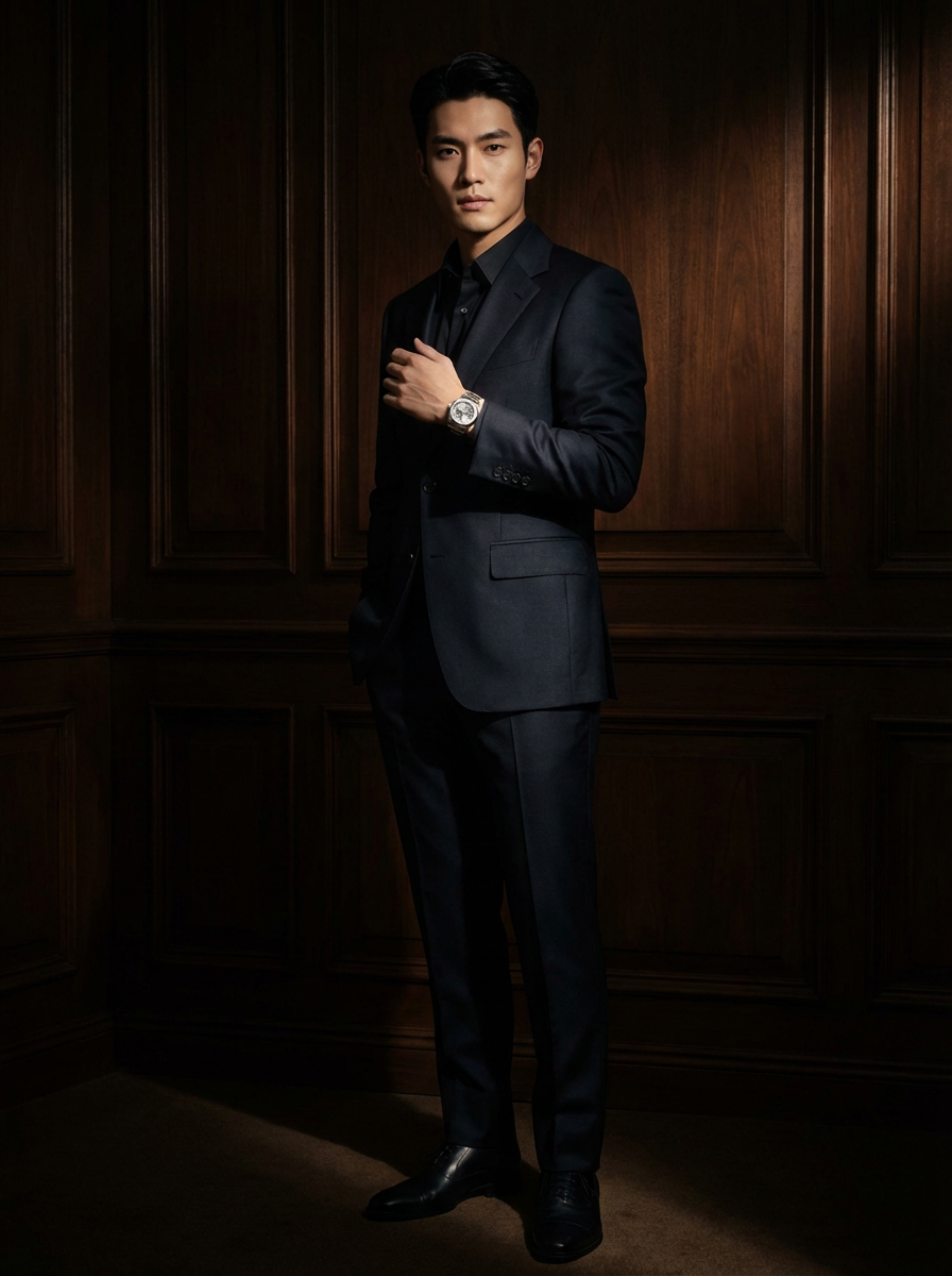 insanely beautiful model in a high-end jewelry campaign. Wearing luxury timepieces, sophisticated stance. Dramatic lighting, luxury product photography.