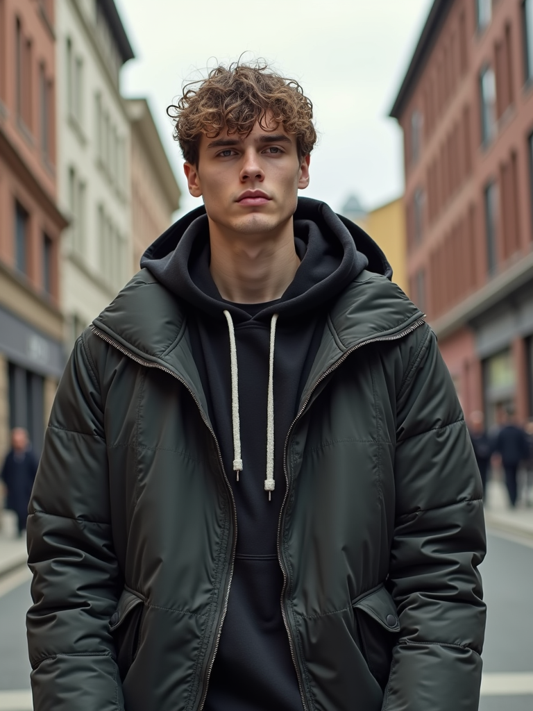 insanely beautiful model in a streetwear campaign. Wearing high-end street fashion, urban stance. City backdrop, contemporary fashion photography.