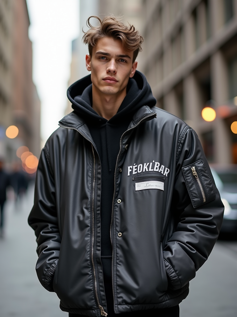 insanely beautiful model in a streetwear campaign. Wearing high-end street fashion, urban stance. City backdrop, contemporary fashion photography.