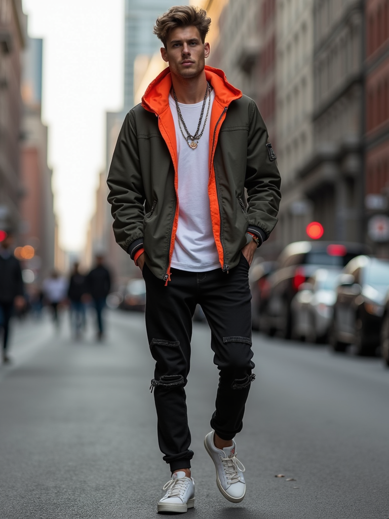 insanely beautiful model in a streetwear campaign. Wearing high-end street fashion, urban stance. City backdrop, contemporary fashion photography.