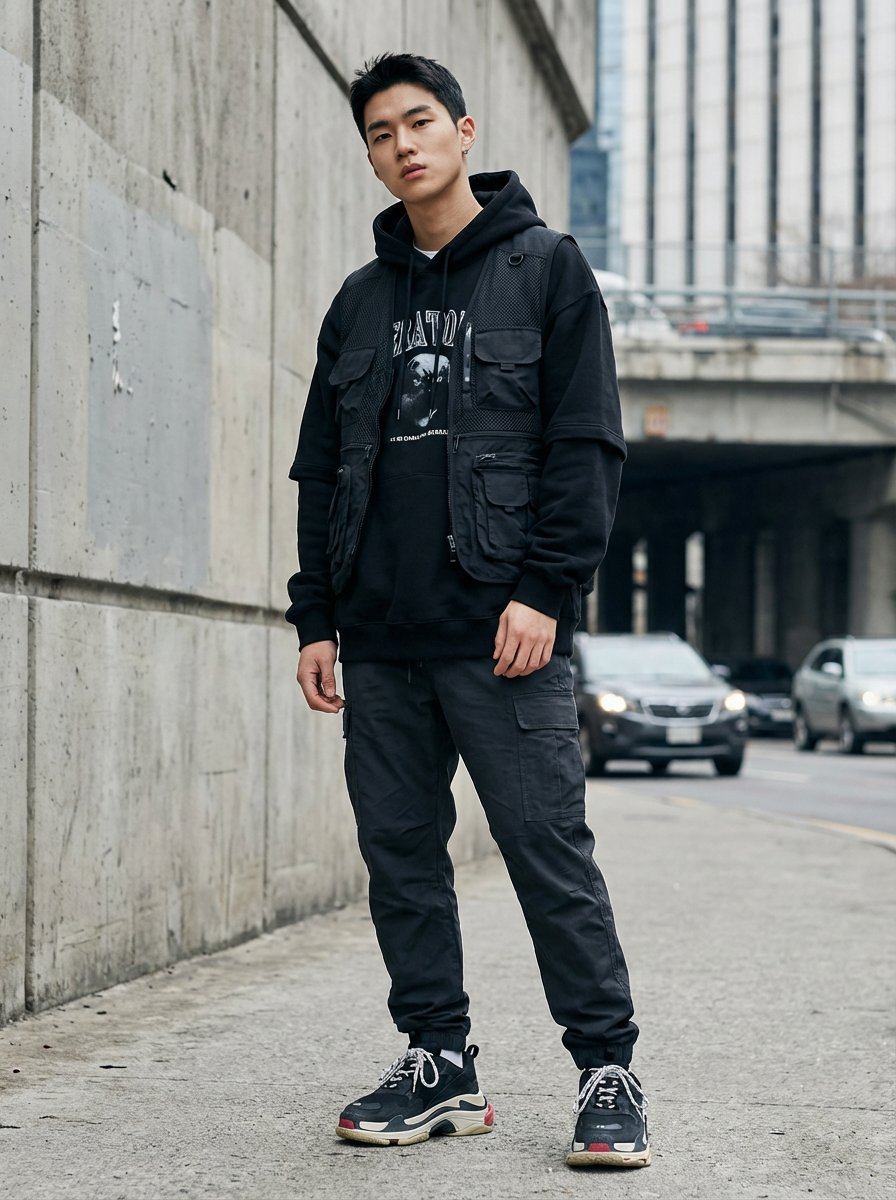 insanely beautiful model in a streetwear campaign. Wearing high-end street fashion, urban stance. City backdrop, contemporary fashion photography.