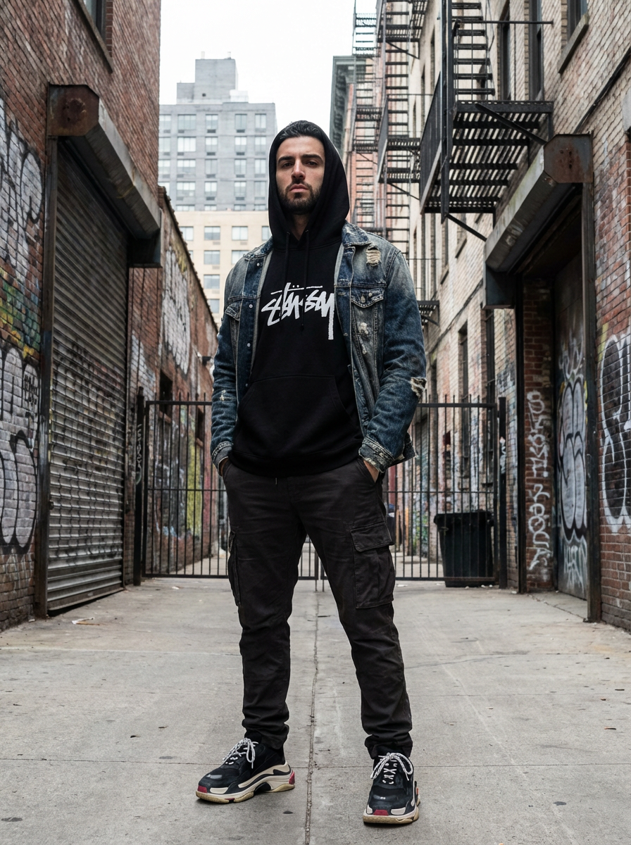 insanely beautiful model in a streetwear campaign. Wearing high-end street fashion, urban stance. City backdrop, contemporary fashion photography.