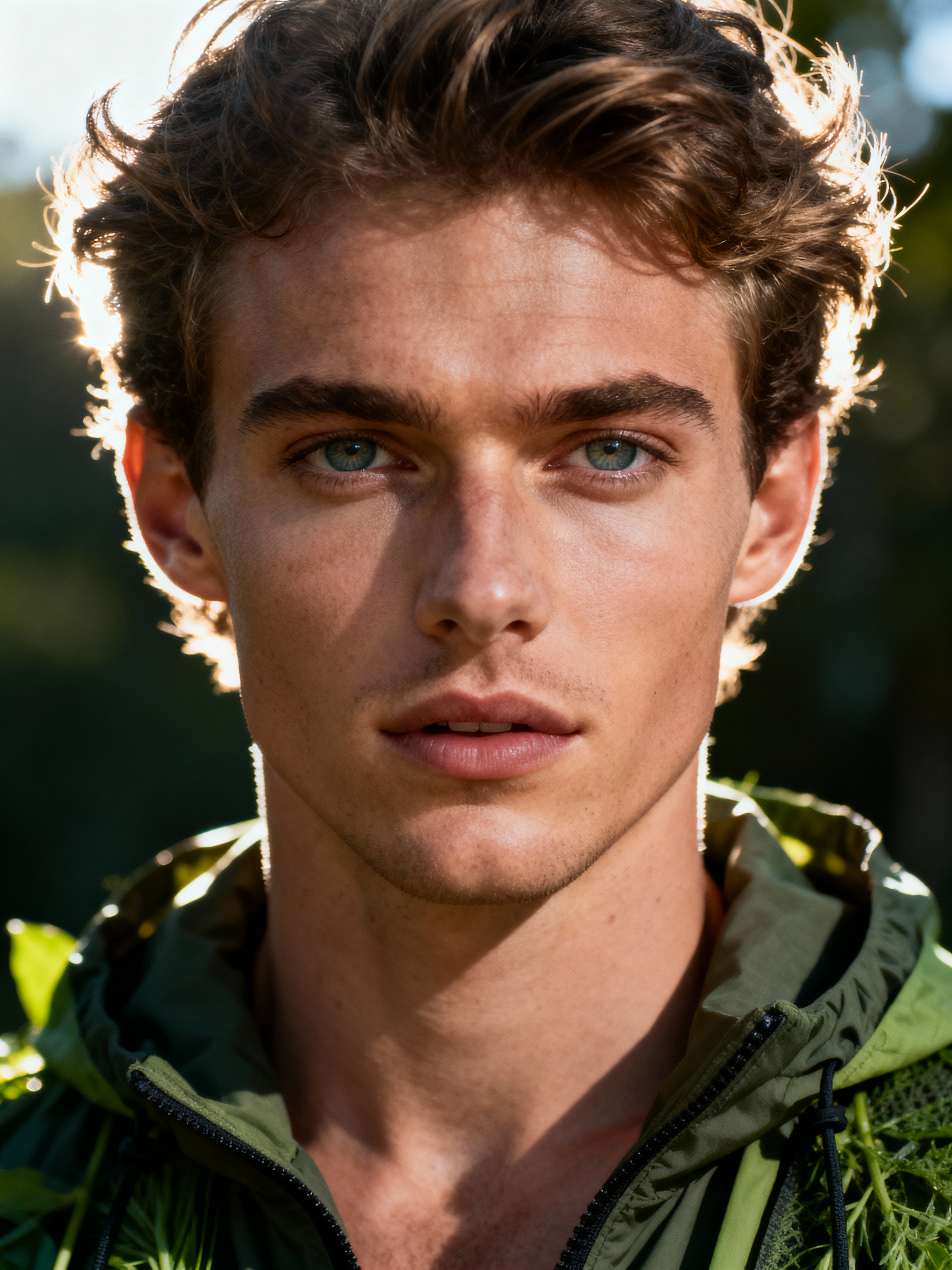 insanely beautiful model in a sustainable fashion campaign. Wearing sustainable high fashion, mindful stance. Natural setting, eco-fashion photography.