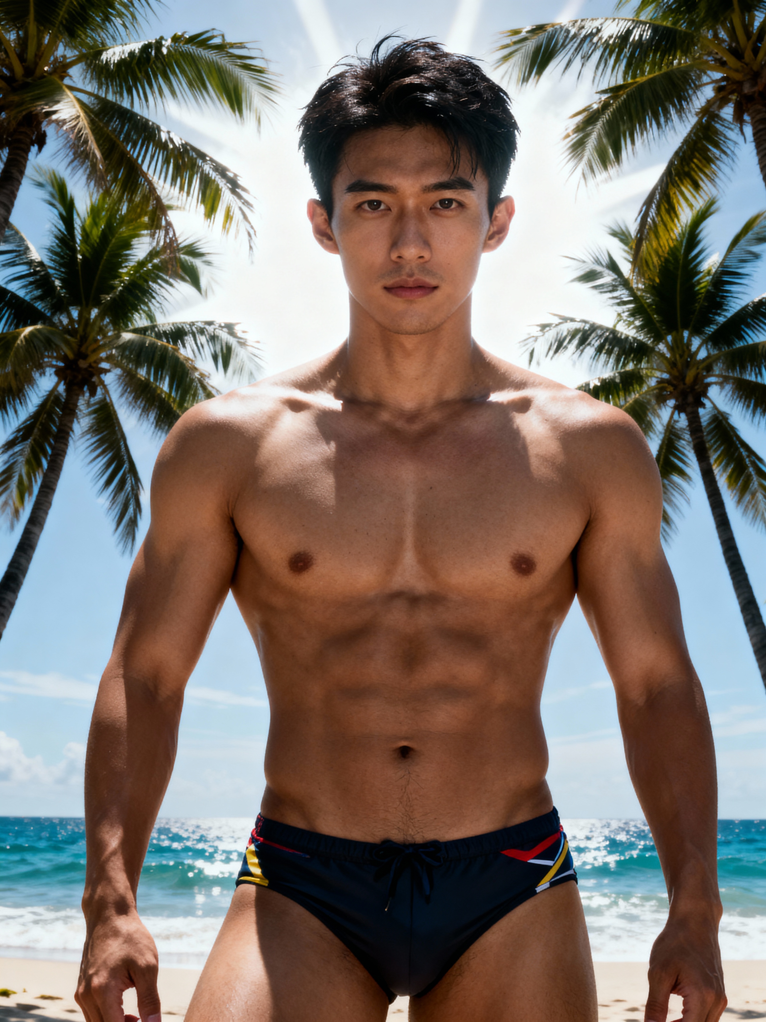 insanely beautiful model in a swimwear editorial. Wearing premium swim trunks, confident stance. Tropical setting, fashion photography.