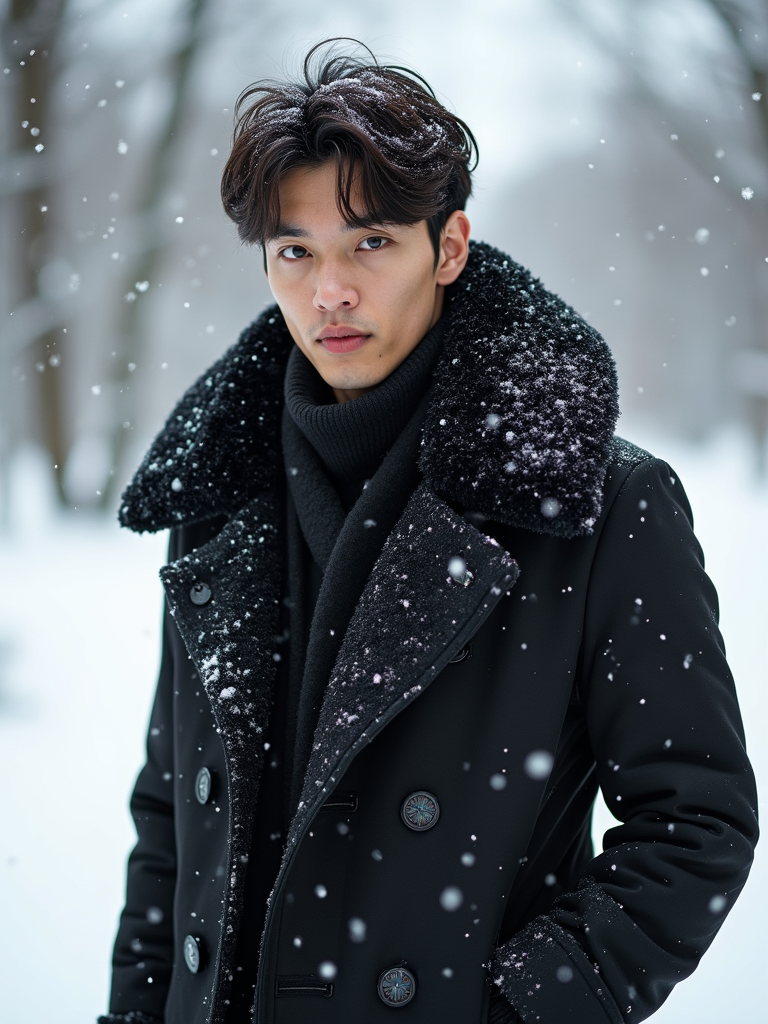 insanely beautiful model in a winter fashion editorial. Wearing luxury cold-weather fashion, commanding stance. Snowy backdrop, winter fashion photography.