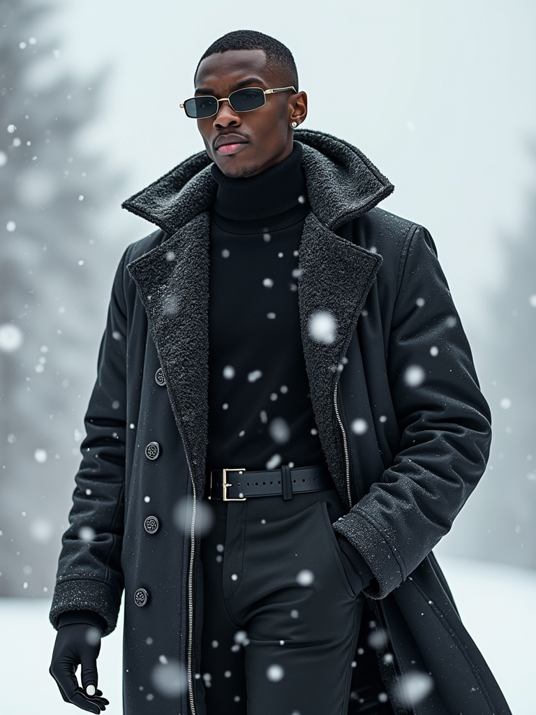 insanely beautiful model in a winter fashion editorial. Wearing luxury cold-weather fashion, commanding stance. Snowy backdrop, winter fashion photography.