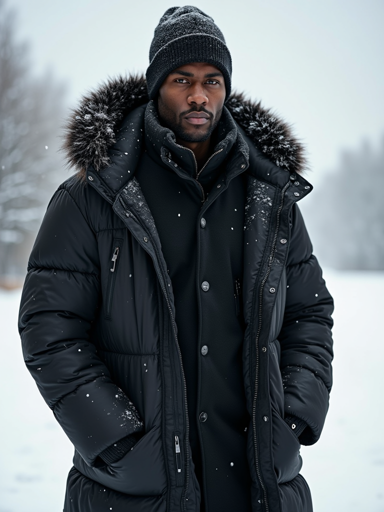 insanely beautiful model in a winter fashion editorial. Wearing luxury cold-weather fashion, commanding stance. Snowy backdrop, winter fashion photography.