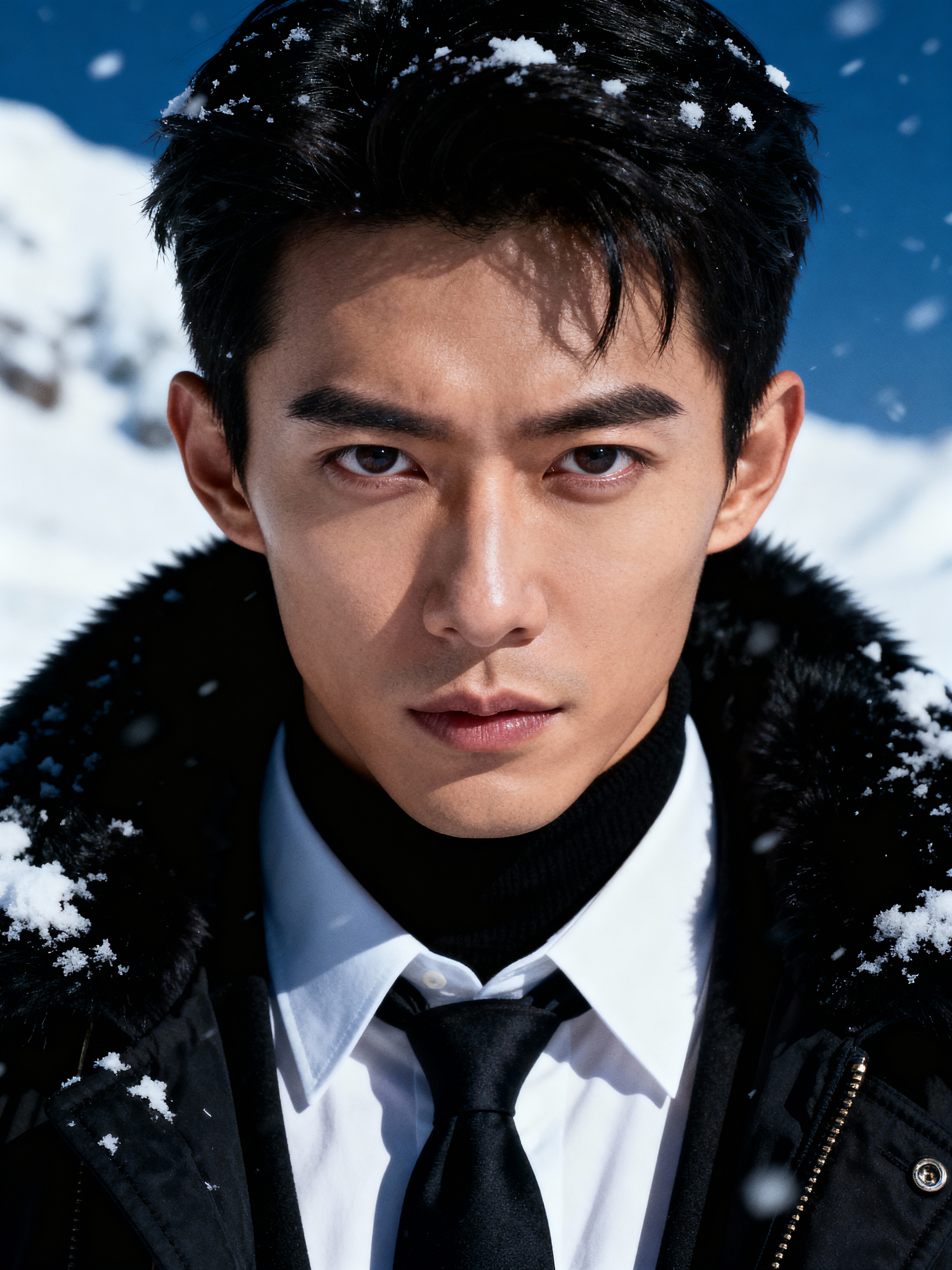 insanely beautiful model in a winter fashion editorial. Wearing luxury cold-weather fashion, commanding stance. Snowy backdrop, winter fashion photography.