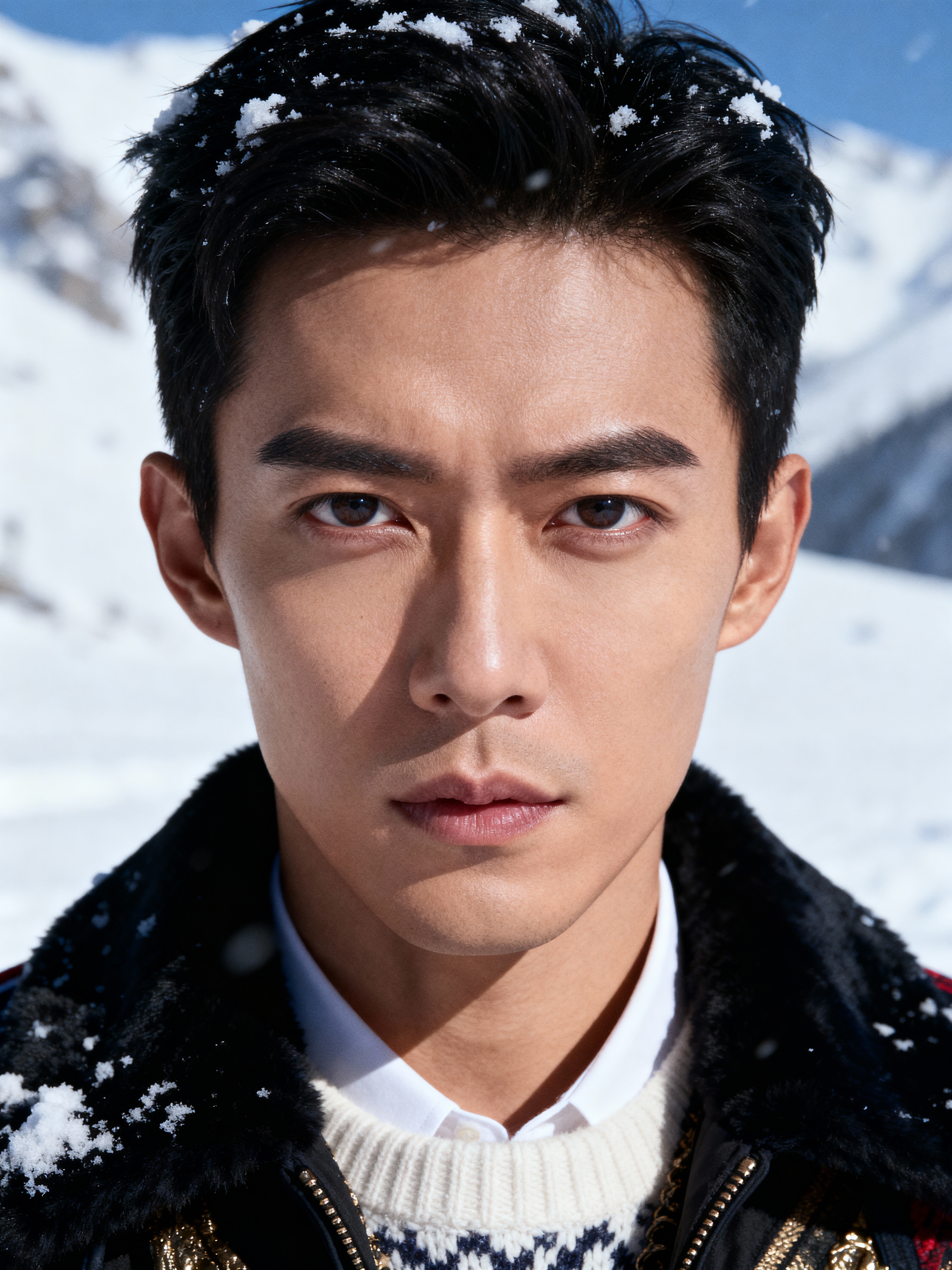 insanely beautiful model in a winter fashion editorial. Wearing luxury cold-weather fashion, commanding stance. Snowy backdrop, winter fashion photography.