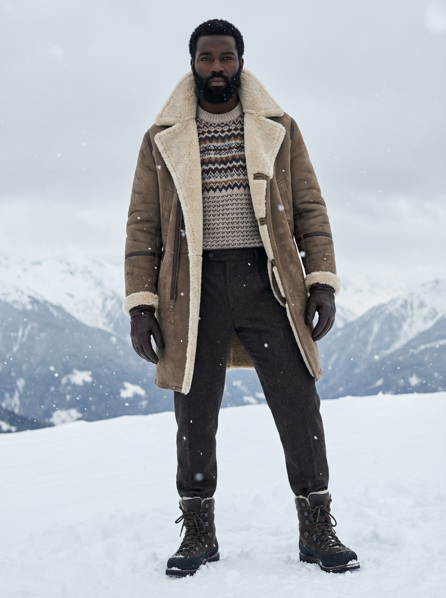 insanely beautiful model in a winter fashion editorial. Wearing luxury cold-weather fashion, commanding stance. Snowy backdrop, winter fashion photography.