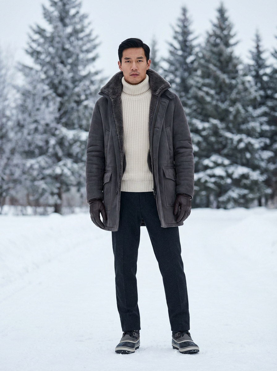insanely beautiful model in a winter fashion editorial. Wearing luxury cold-weather fashion, commanding stance. Snowy backdrop, winter fashion photography.