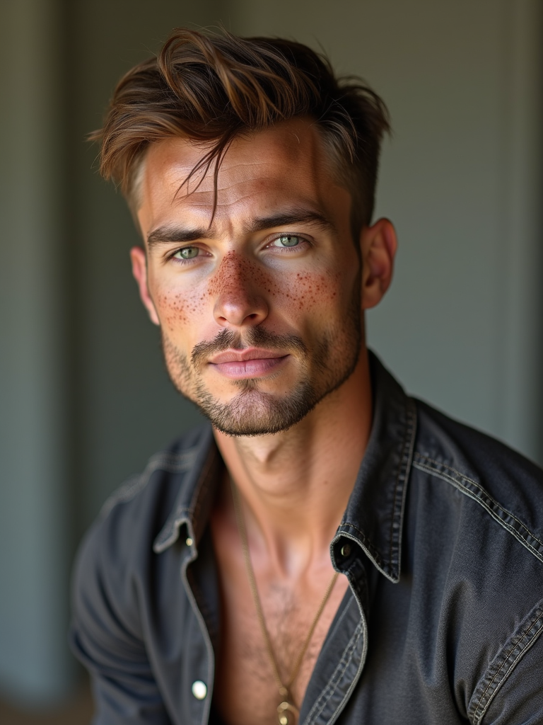 insanely beautiful model with freckles in a commercial lifestyle shoot. Wearing premium casual wear, natural expression. Lifestyle setting, commercial photography.