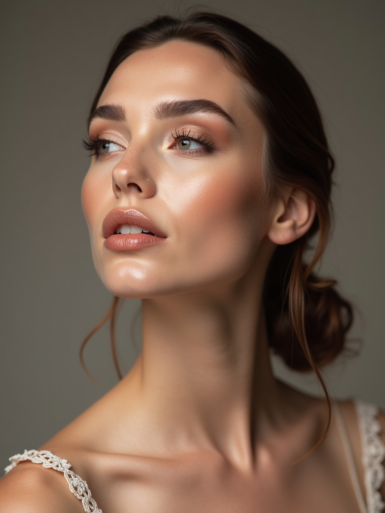 insanely beautiful model in a beauty campaign. Flawless makeup, perfect skin, elegant expression . Clean studio lighting, beauty photography.