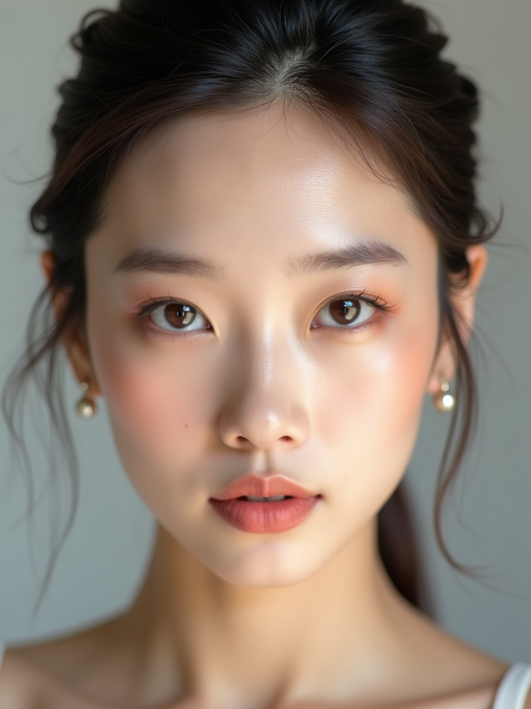 insanely beautiful model in a beauty campaign. Flawless makeup, perfect skin, elegant expression . Clean studio lighting, beauty photography.