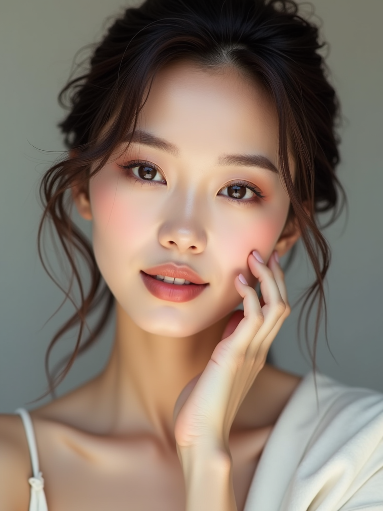 insanely beautiful model in a beauty campaign. Flawless makeup, perfect skin, elegant expression . Clean studio lighting, beauty photography.