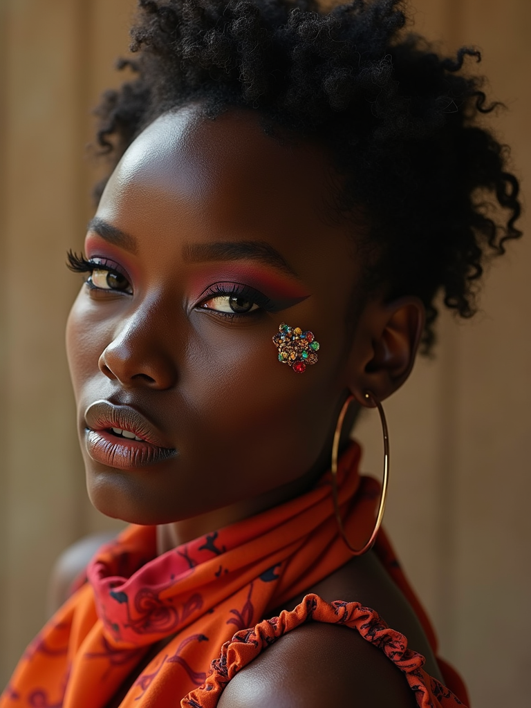 insanely beautiful model in a creative fashion editorial. Wearing artistic fashion pieces, expressive pose . Artistic lighting, fashion magazine style.