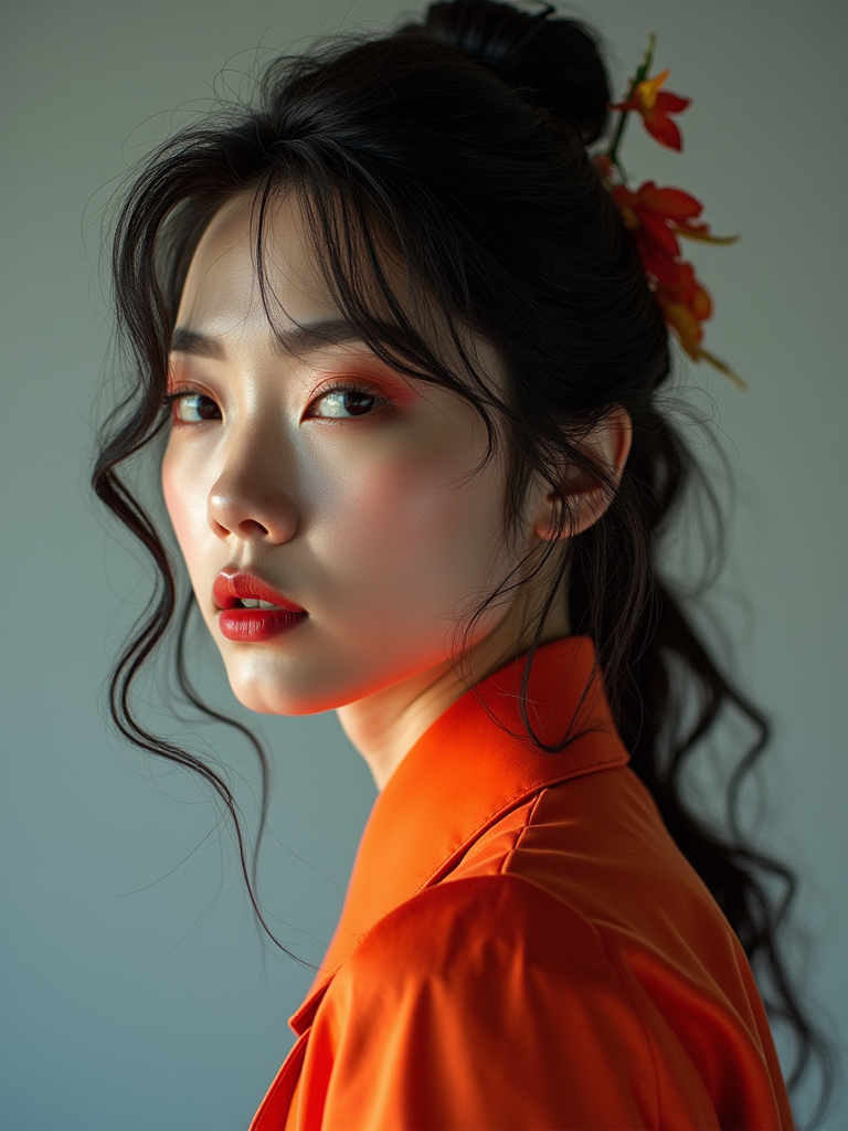 insanely beautiful model in a creative fashion editorial. Wearing artistic fashion pieces, expressive pose . Artistic lighting, fashion magazine style.