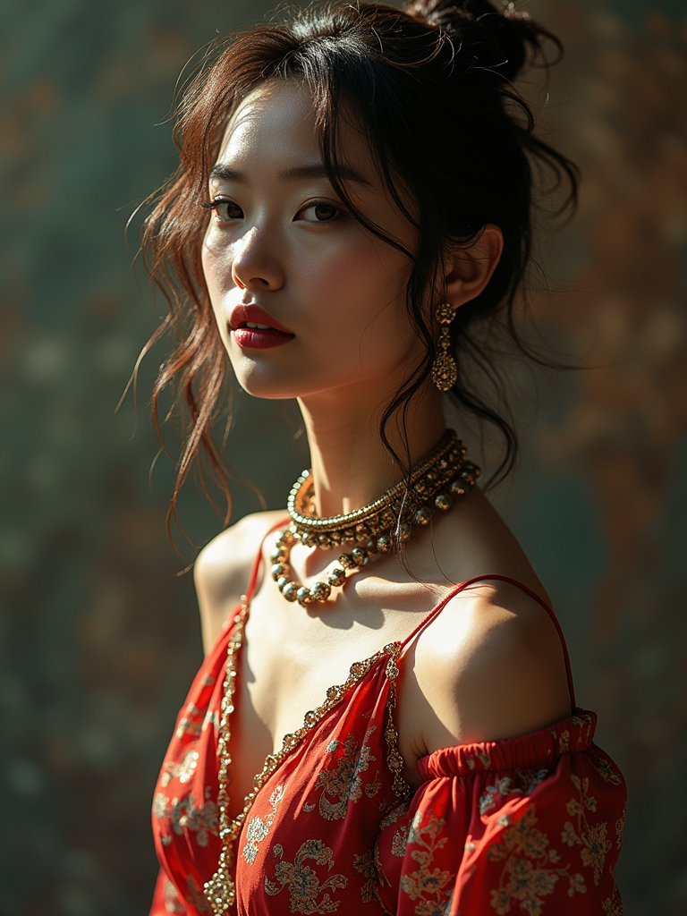insanely beautiful model in a creative fashion editorial. Wearing artistic fashion pieces, expressive pose . Artistic lighting, fashion magazine style.