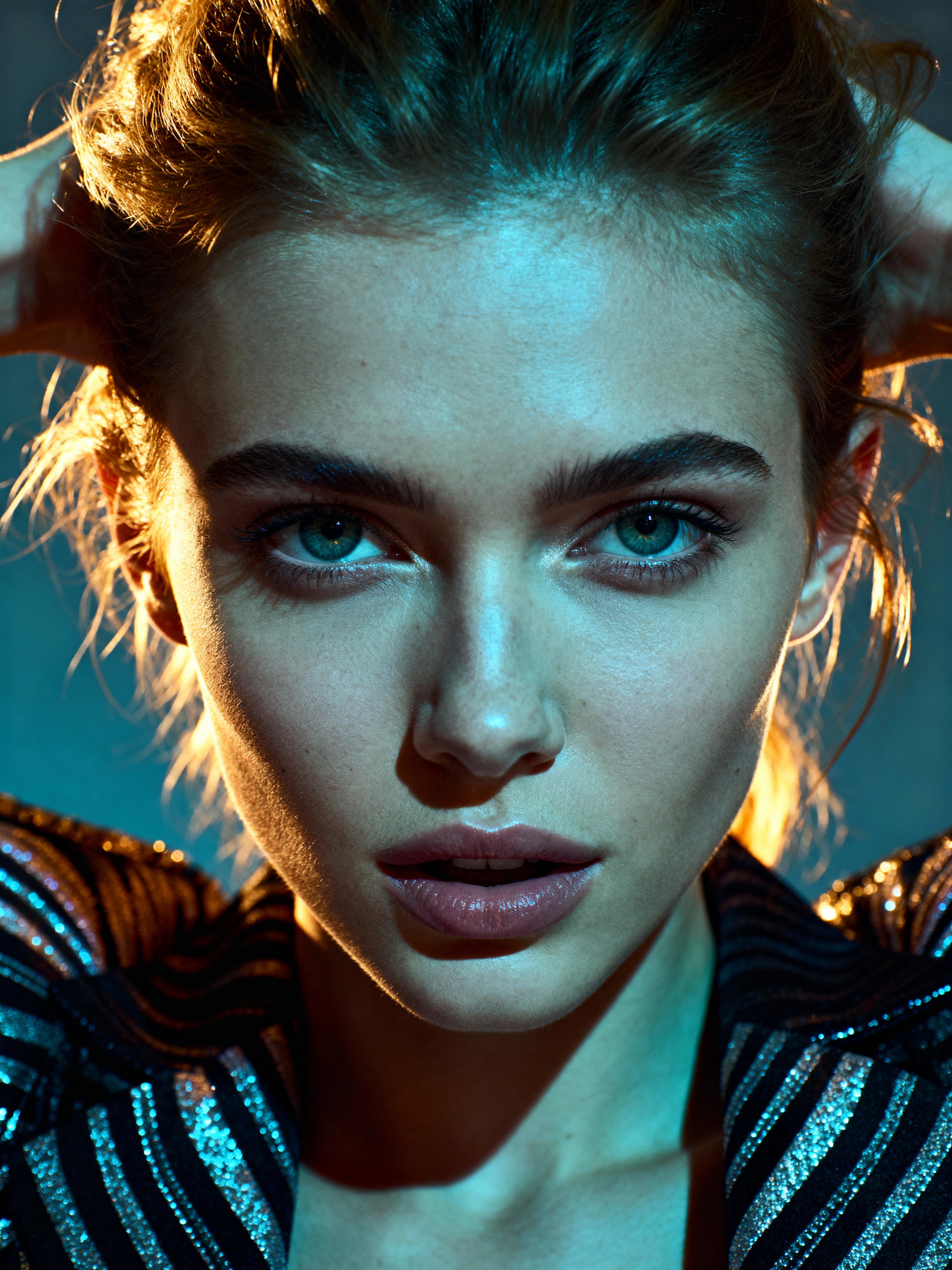 insanely beautiful model in a creative fashion editorial. Wearing artistic fashion pieces, expressive pose . Artistic lighting, fashion magazine style.