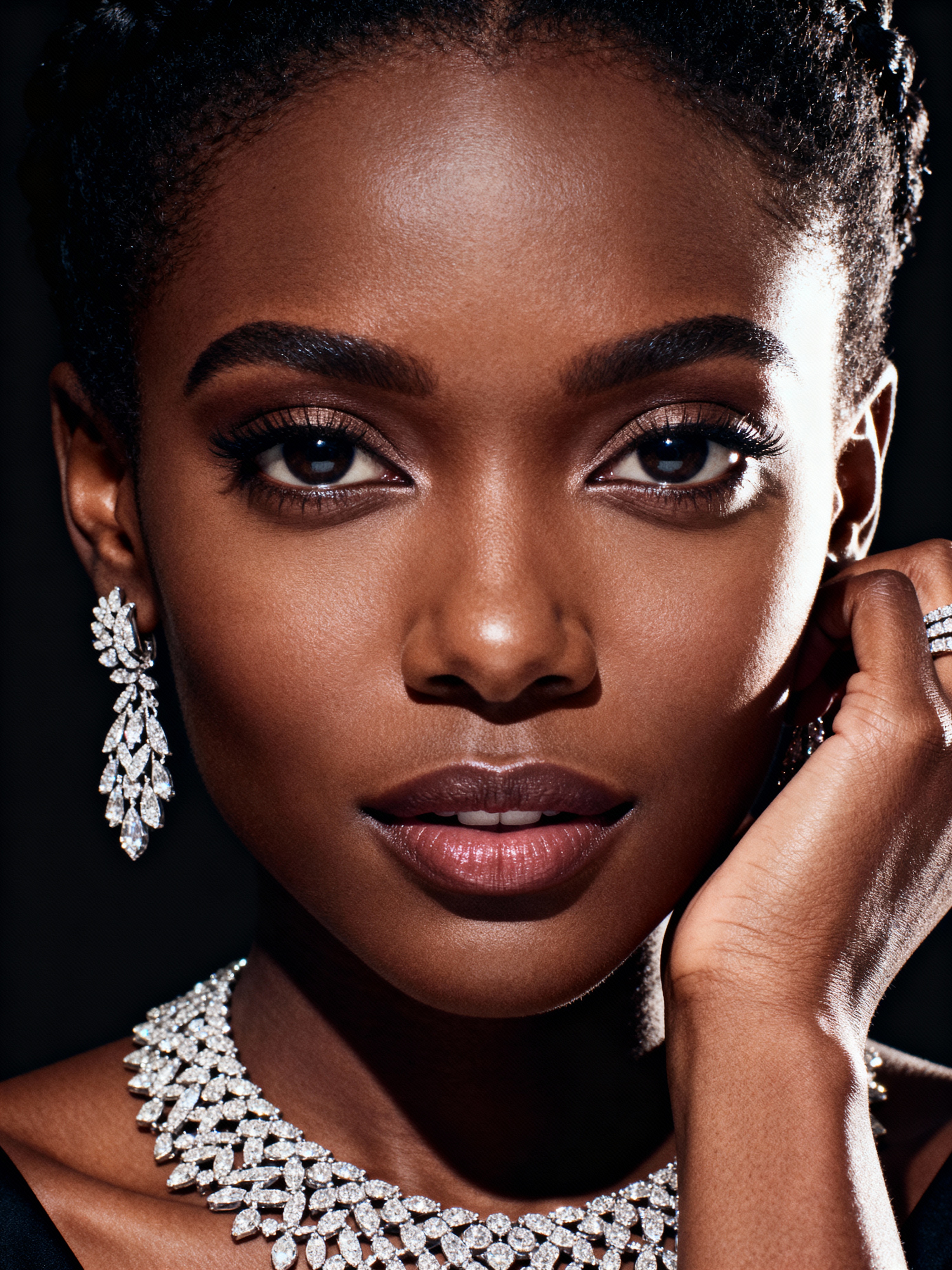 insanely beautiful model in a high-end jewelry campaign. Wearing statement jewelry pieces, elegant pose . Dramatic lighting, luxury product photography.