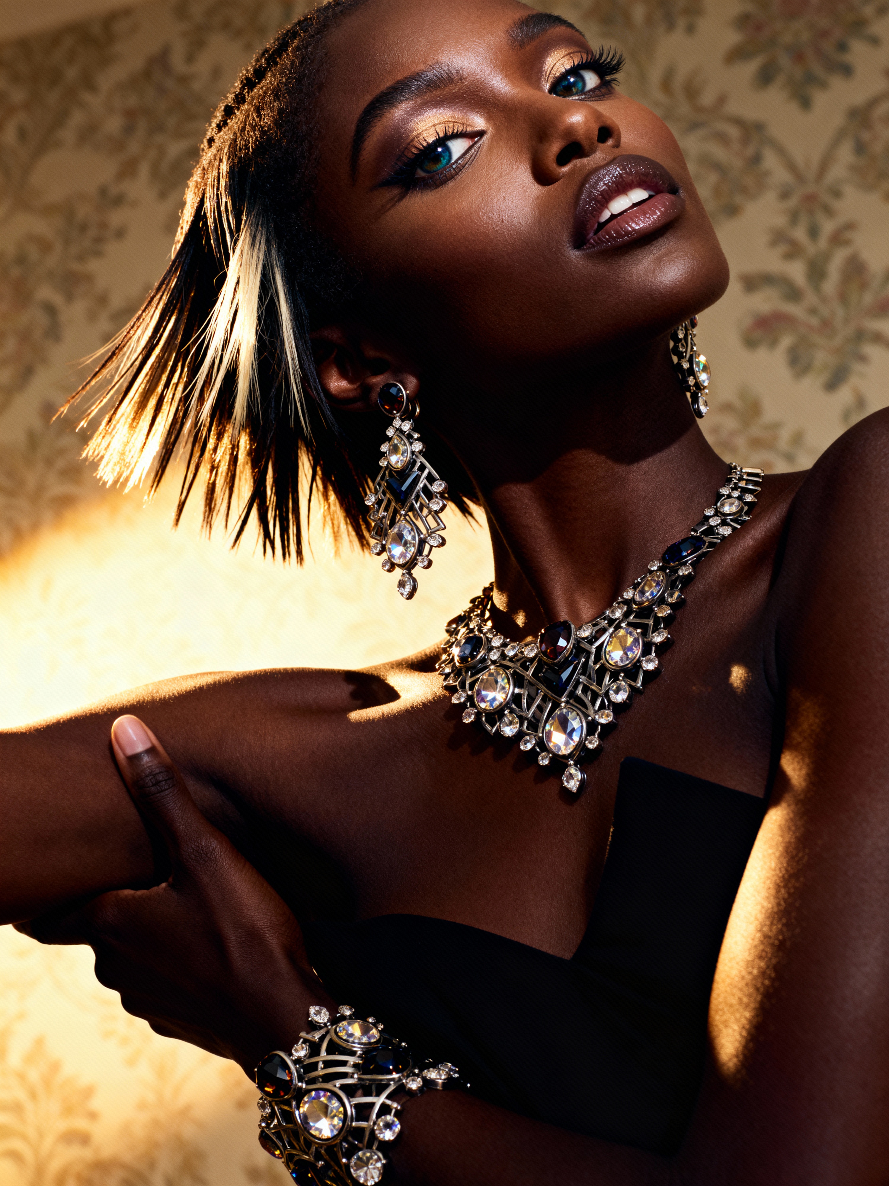 insanely beautiful model in a high-end jewelry campaign. Wearing statement jewelry pieces, elegant pose . Dramatic lighting, luxury product photography.
