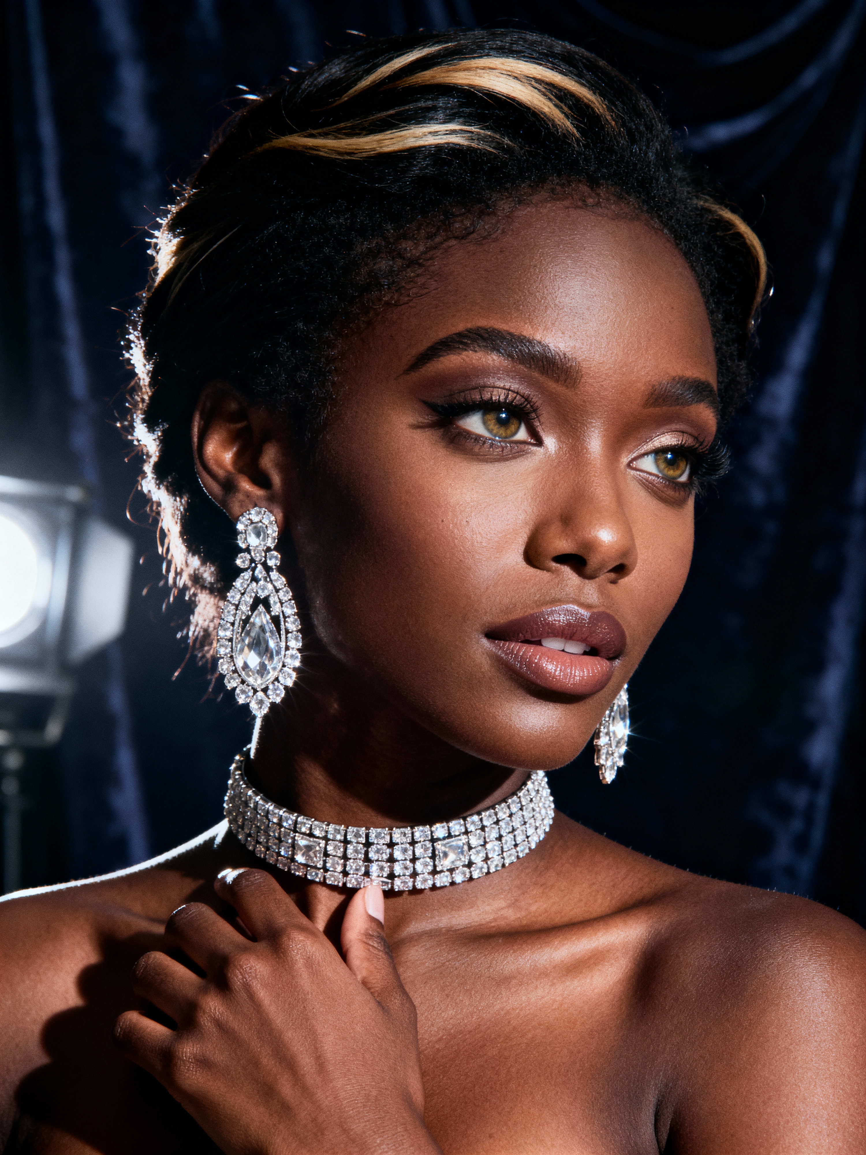 insanely beautiful model in a high-end jewelry campaign. Wearing statement jewelry pieces, elegant pose . Dramatic lighting, luxury product photography.