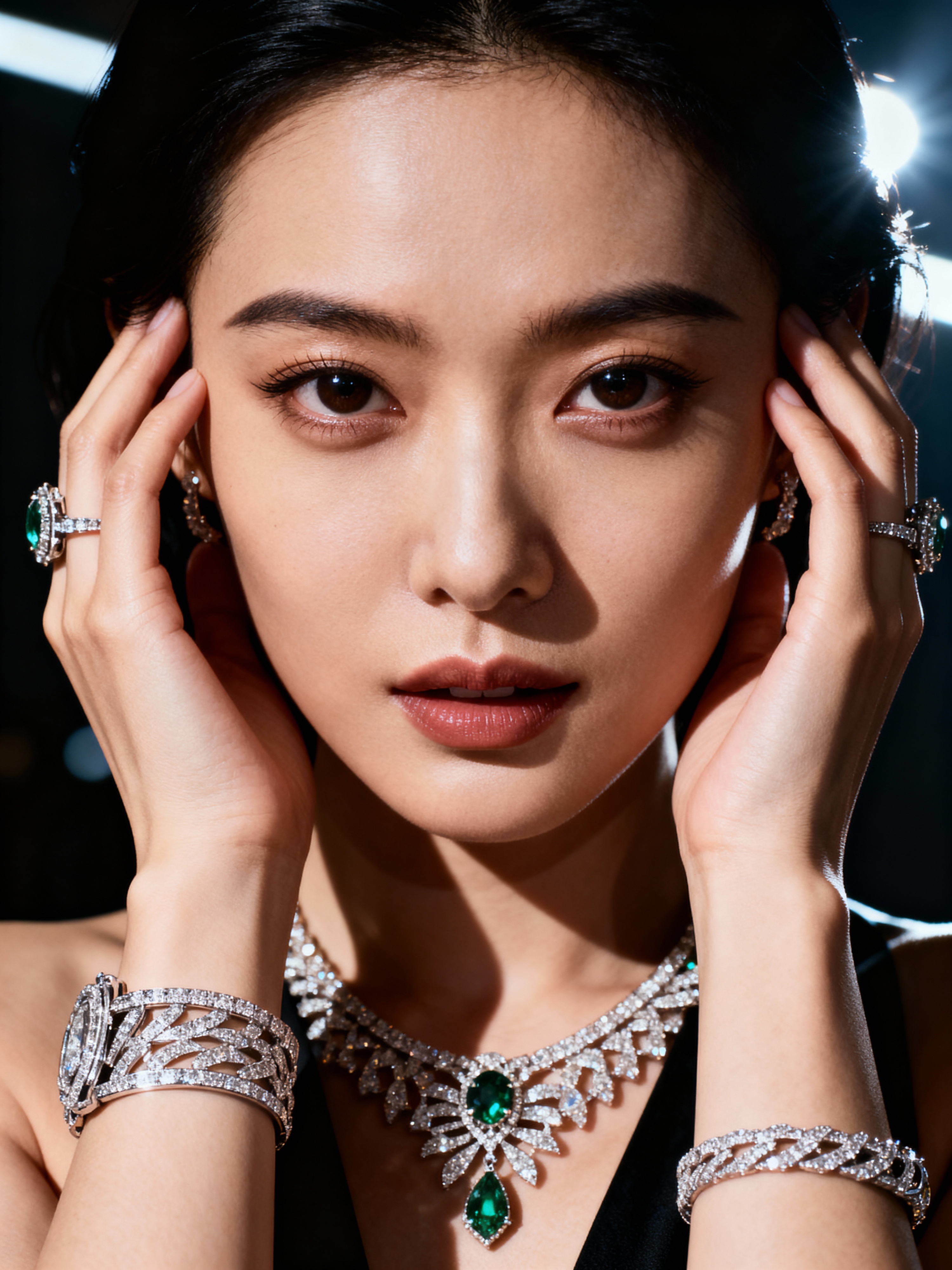 insanely beautiful model in a high-end jewelry campaign. Wearing statement jewelry pieces, elegant pose . Dramatic lighting, luxury product photography.