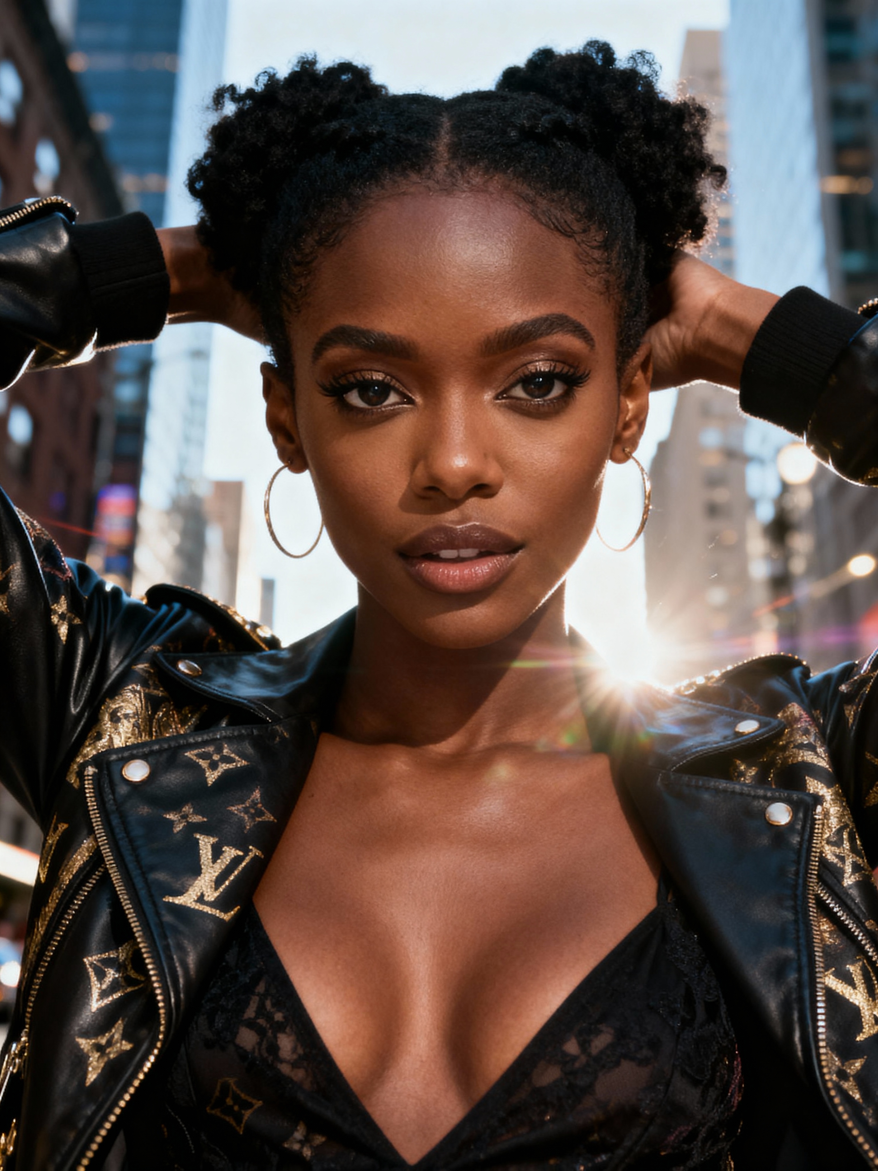 insanely beautiful model in a streetwear campaign. Wearing urban luxury streetwear, dynamic pose . City backdrop, contemporary fashion photography.