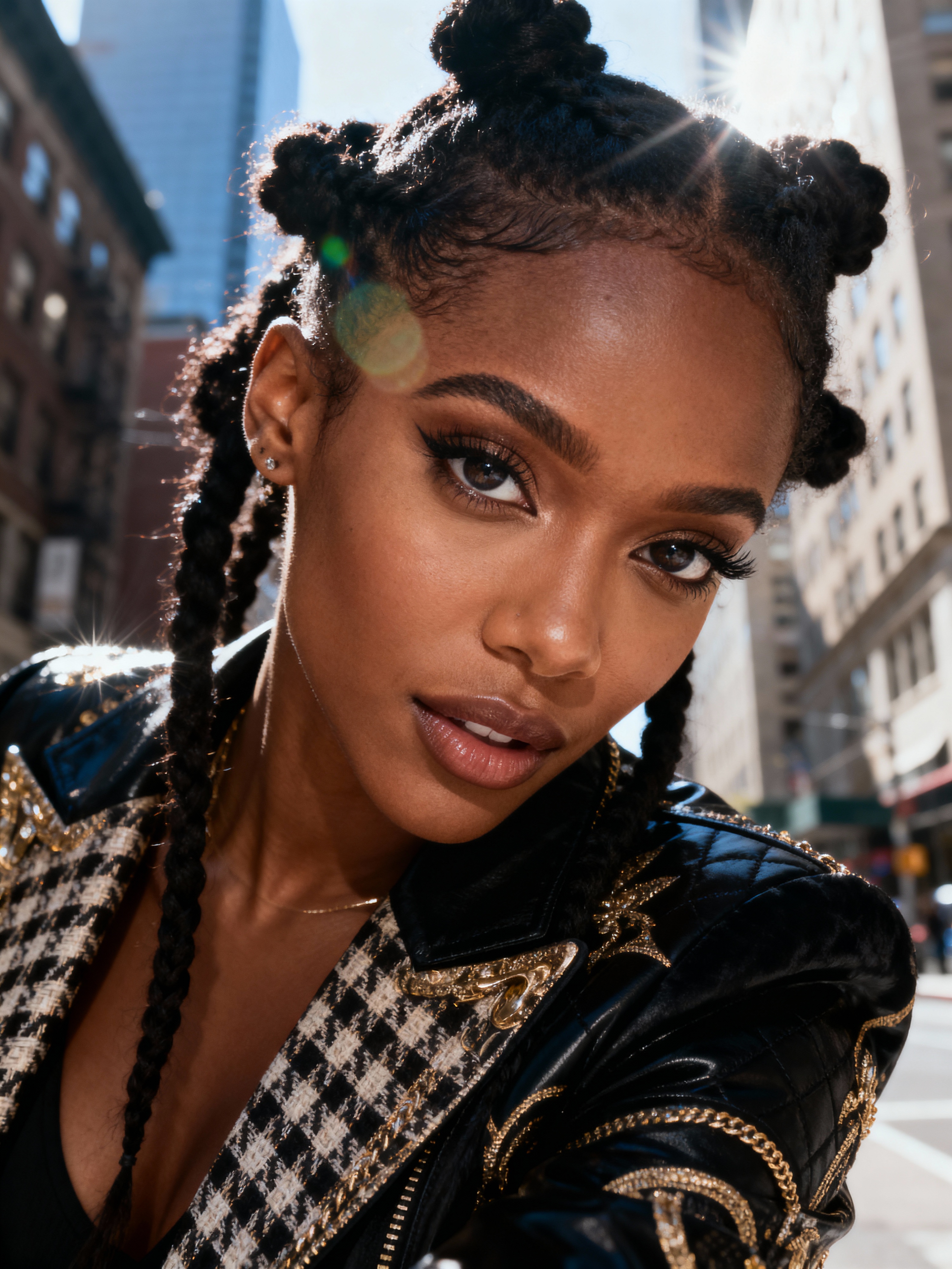 insanely beautiful model in a streetwear campaign. Wearing urban luxury streetwear, dynamic pose . City backdrop, contemporary fashion photography.