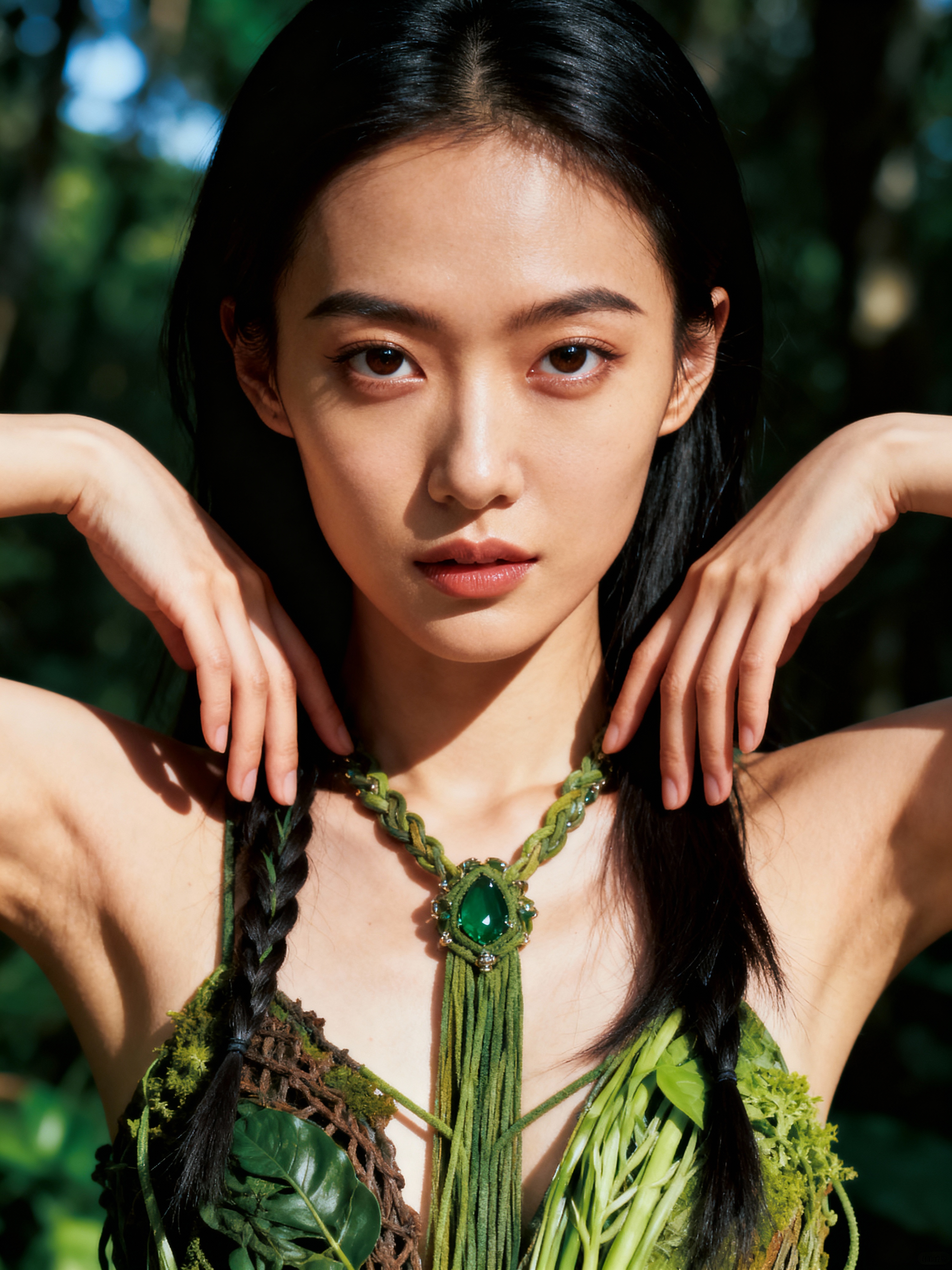 insanely beautiful model in a sustainable fashion campaign. Wearing eco-luxury pieces, conscious pose . Natural setting, eco-fashion photography.