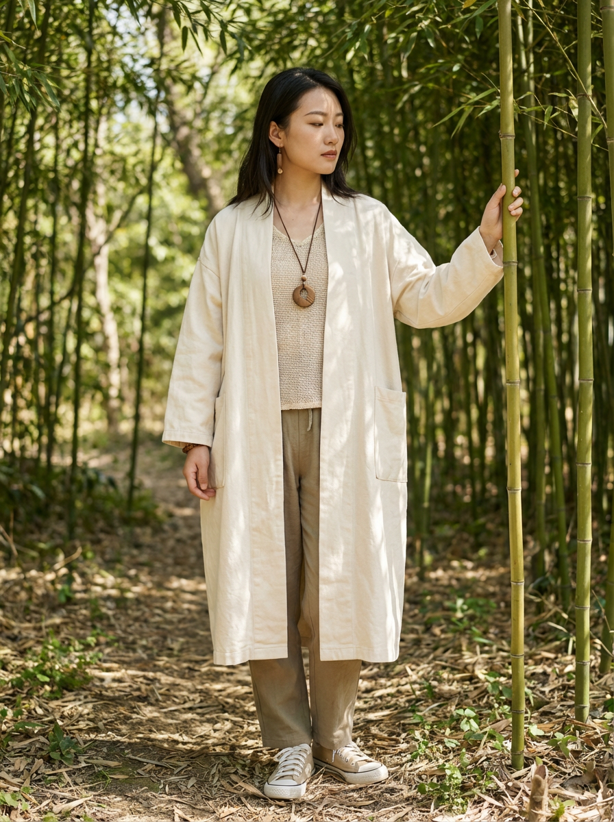 insanely beautiful model in a sustainable fashion campaign. Wearing eco-luxury pieces, conscious pose . Natural setting, eco-fashion photography.