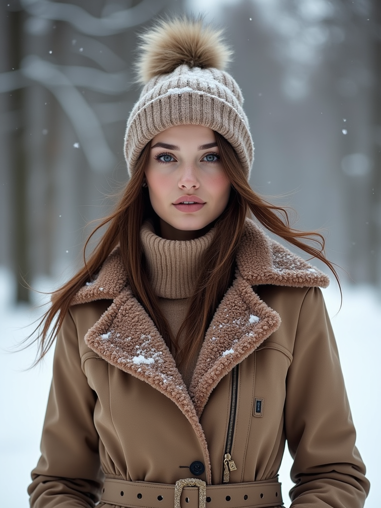 insanely beautiful model in a winter fashion editorial. Wearing designer winter wear, seasonal pose . Snowy backdrop, winter fashion photography.