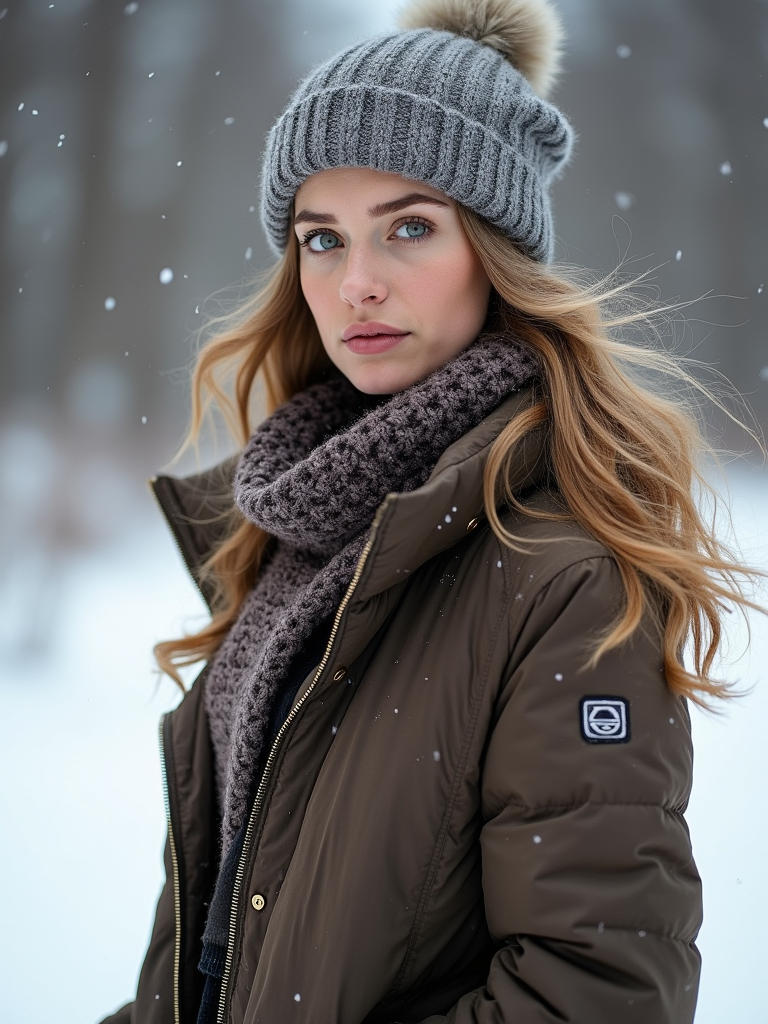 insanely beautiful model in a winter fashion editorial. Wearing designer winter wear, seasonal pose . Snowy backdrop, winter fashion photography.