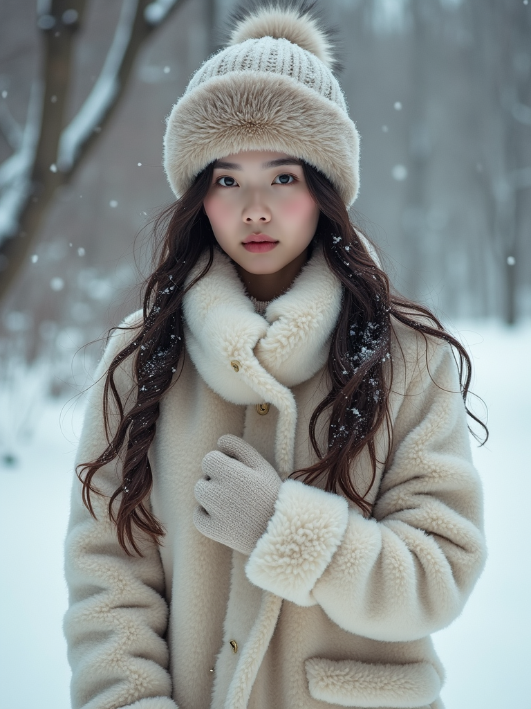 insanely beautiful model in a winter fashion editorial. Wearing designer winter wear, seasonal pose . Snowy backdrop, winter fashion photography.