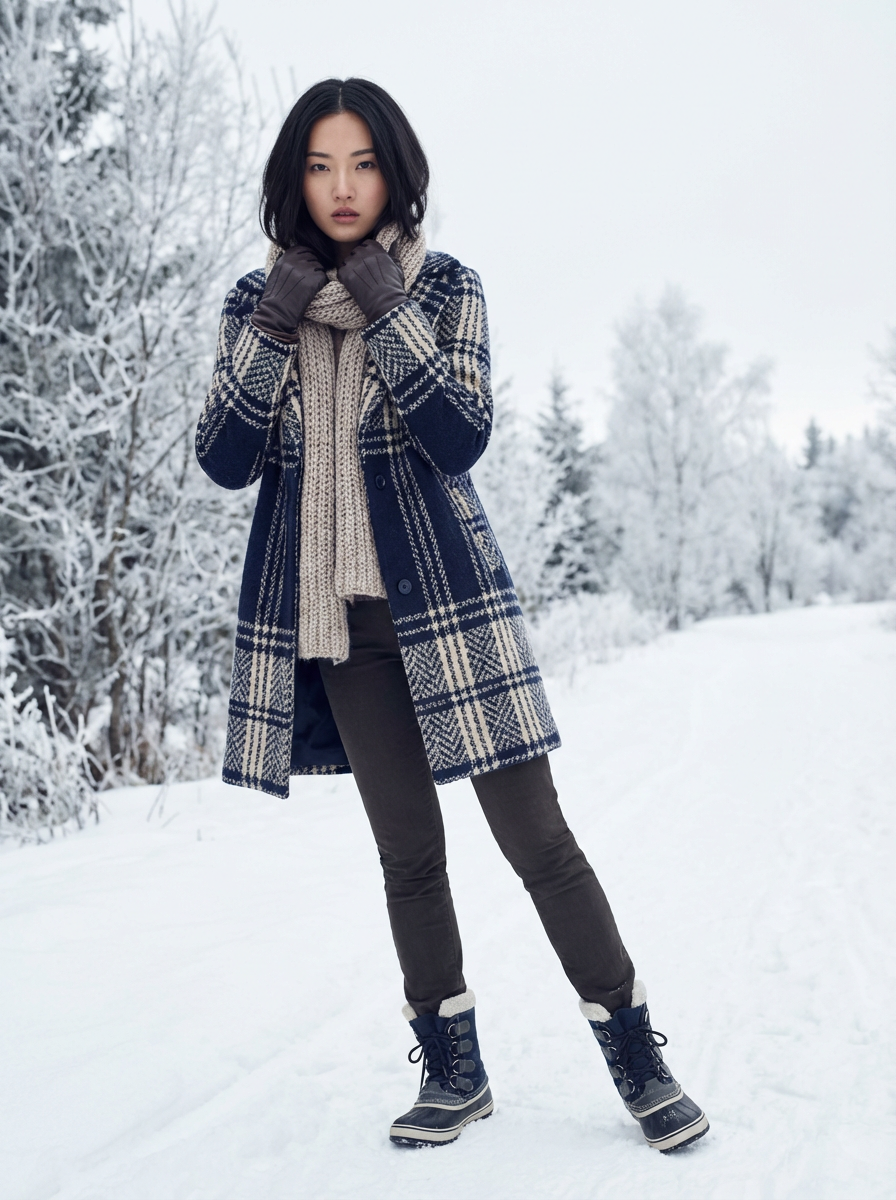insanely beautiful model in a winter fashion editorial. Wearing designer winter wear, seasonal pose . Snowy backdrop, winter fashion photography.