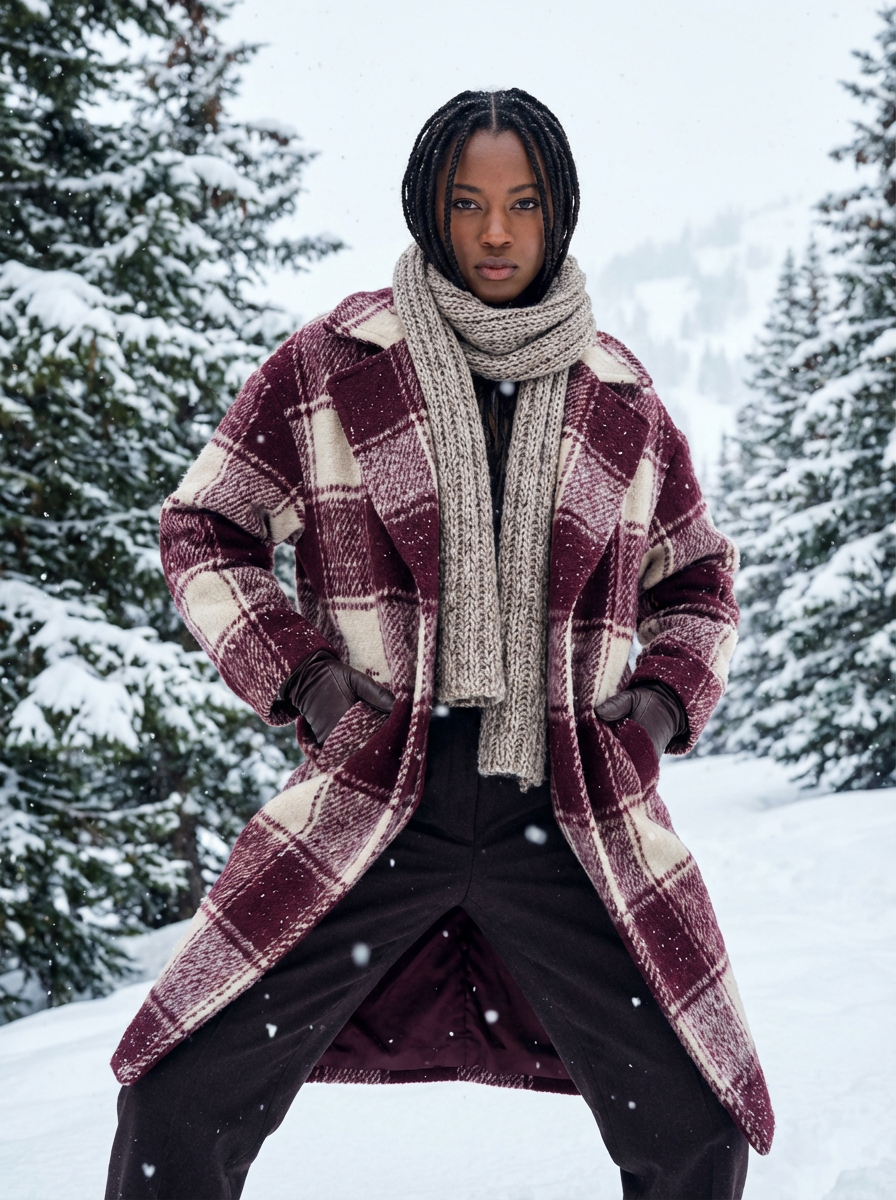 insanely beautiful model in a winter fashion editorial. Wearing designer winter wear, seasonal pose . Snowy backdrop, winter fashion photography.