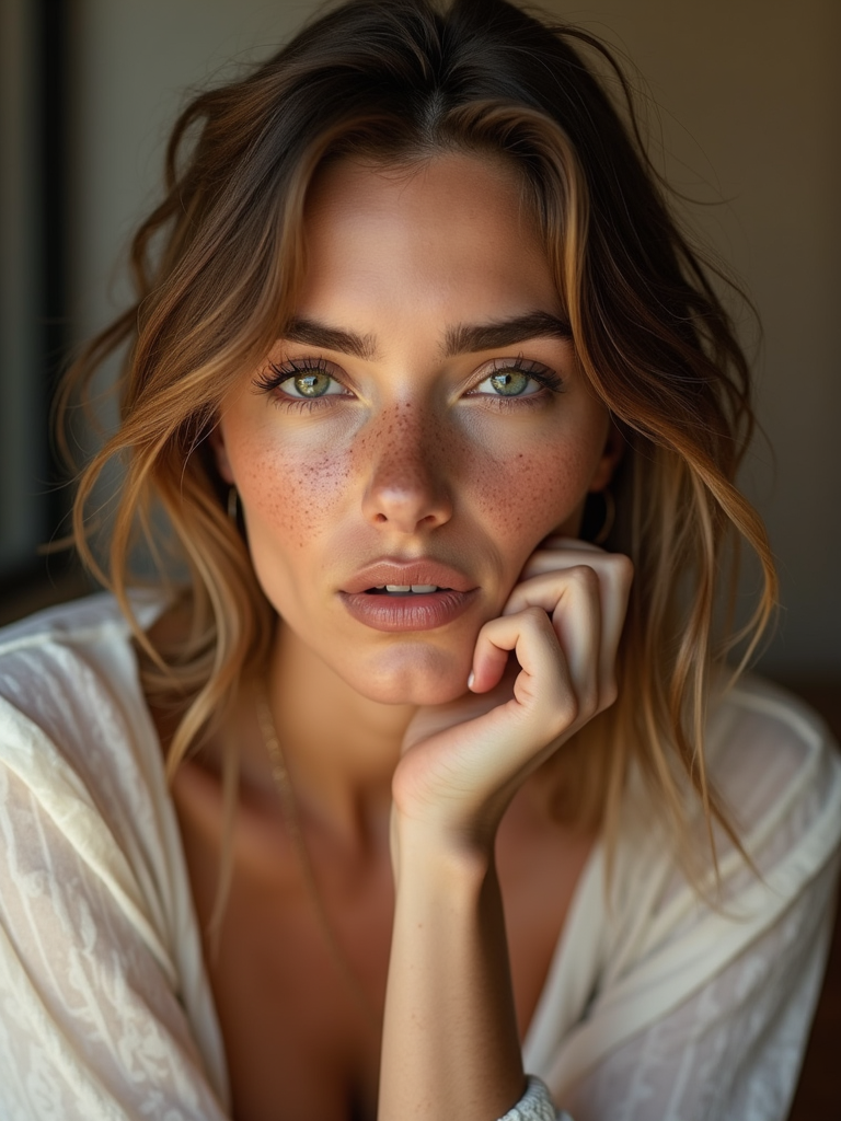 insanely beautiful model with freckles in a commercial lifestyle shoot. Wearing everyday luxury, relatable pose . Lifestyle setting, commercial photography.
