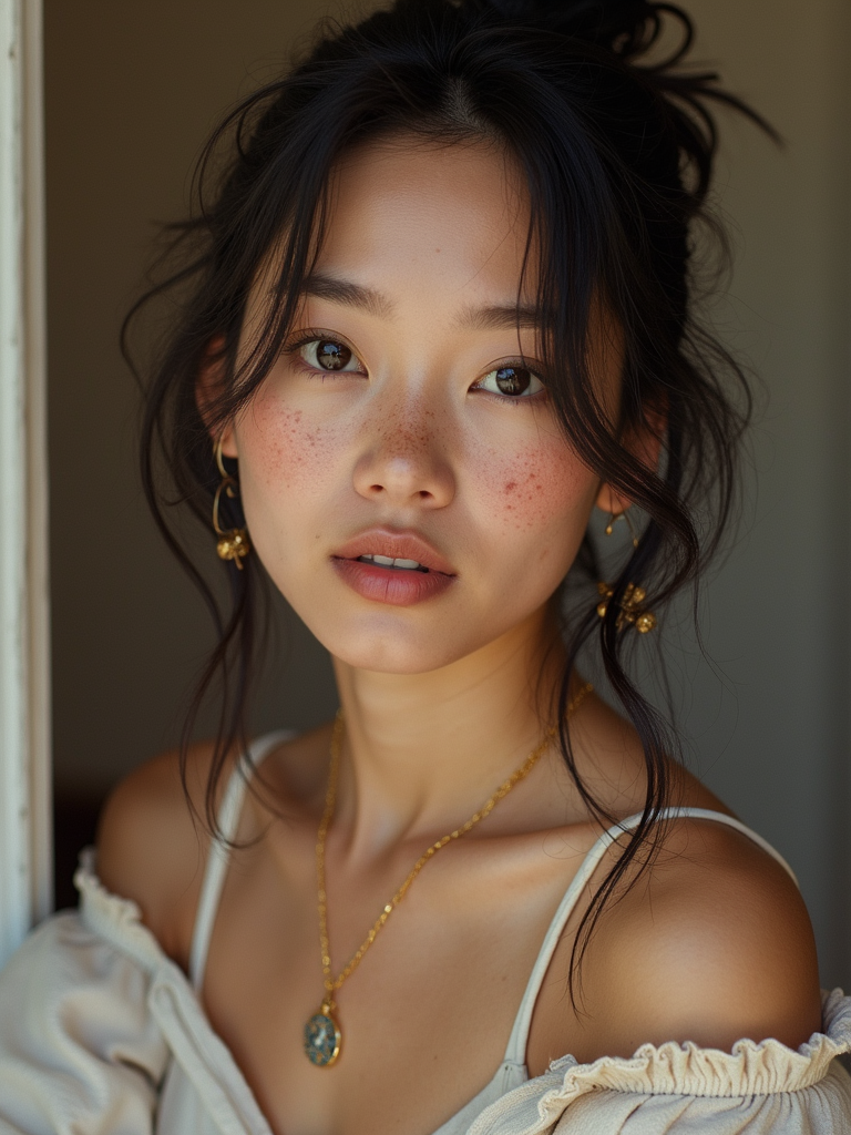 insanely beautiful model with freckles in a commercial lifestyle shoot. Wearing everyday luxury, relatable pose . Lifestyle setting, commercial photography.