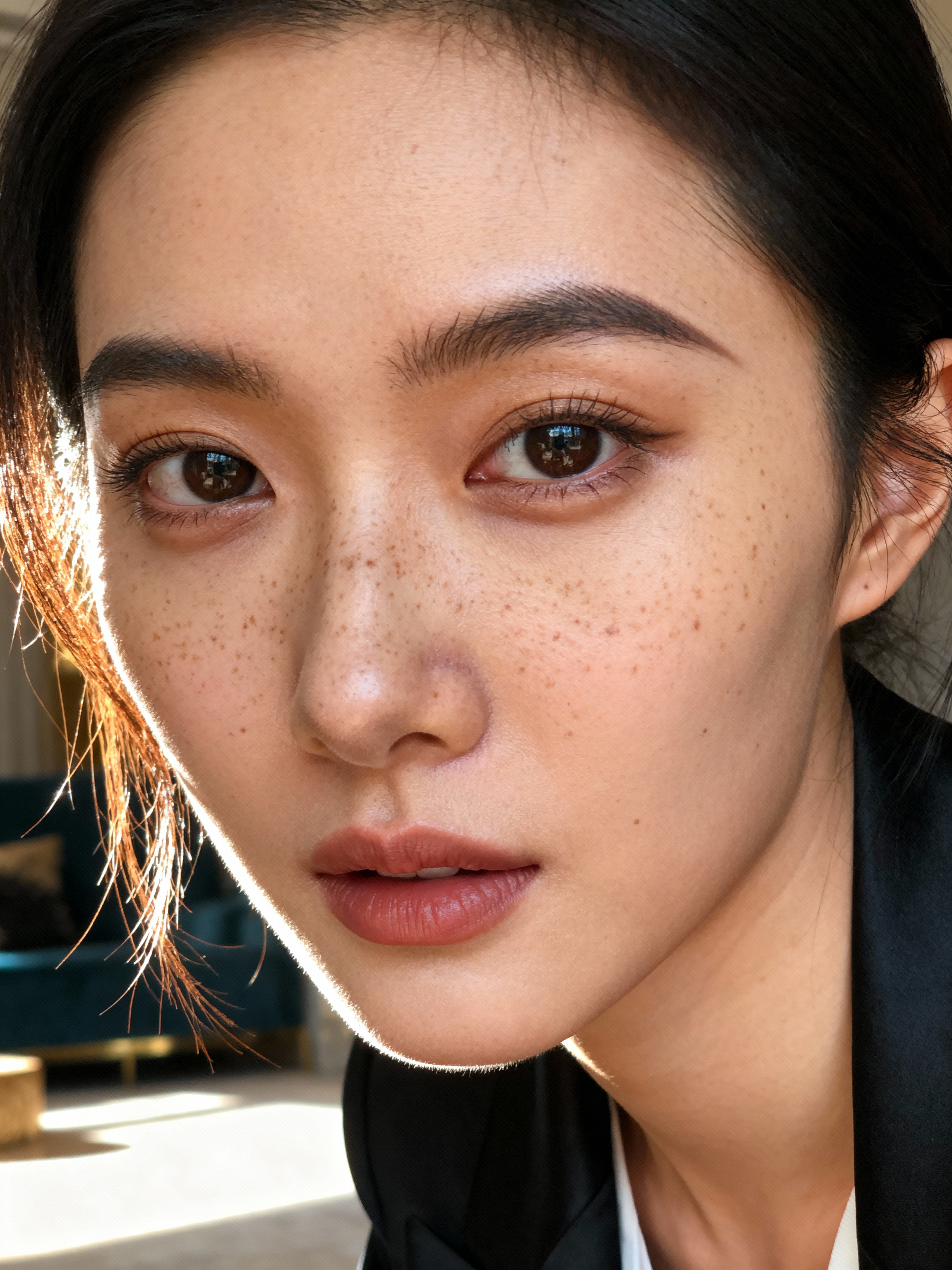 insanely beautiful model with freckles in a commercial lifestyle shoot. Wearing everyday luxury, relatable pose . Lifestyle setting, commercial photography.