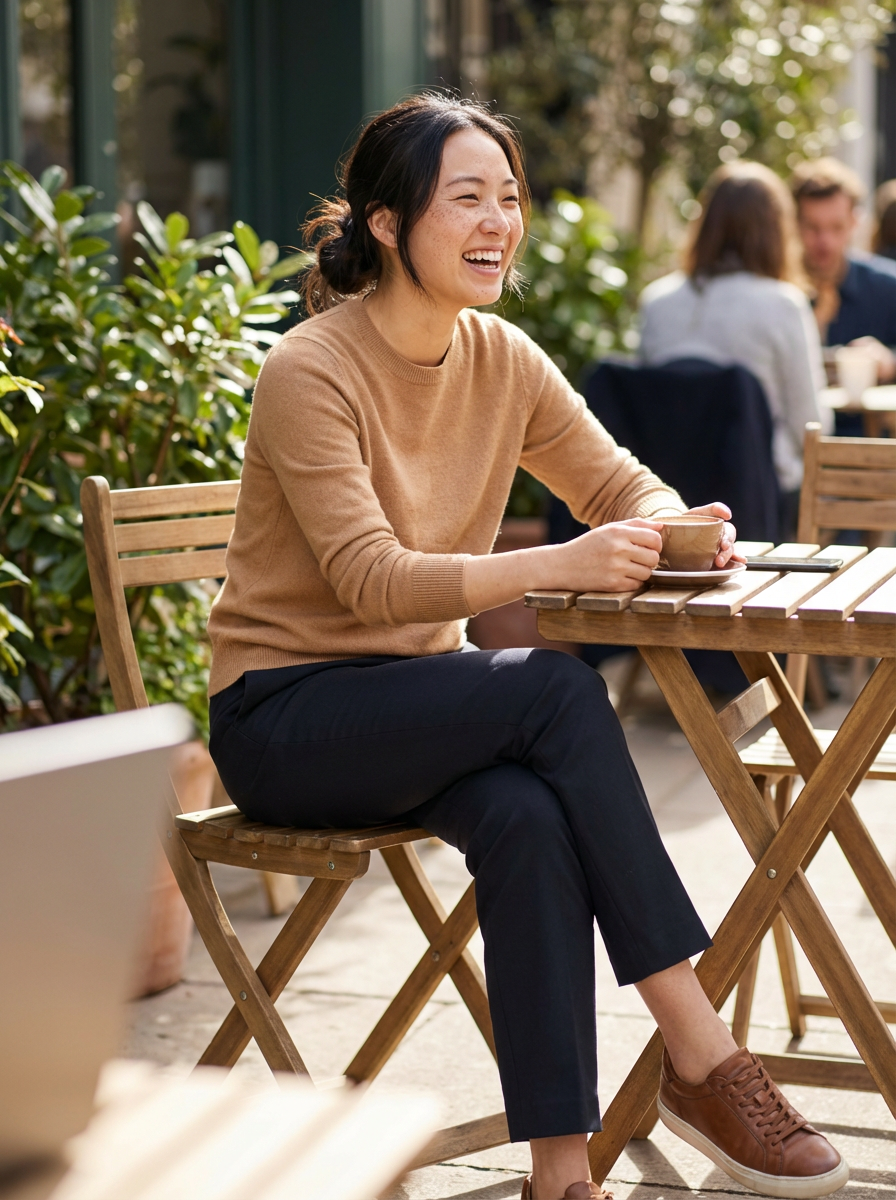 insanely beautiful model with freckles in a commercial lifestyle shoot. Wearing everyday luxury, relatable pose . Lifestyle setting, commercial photography.