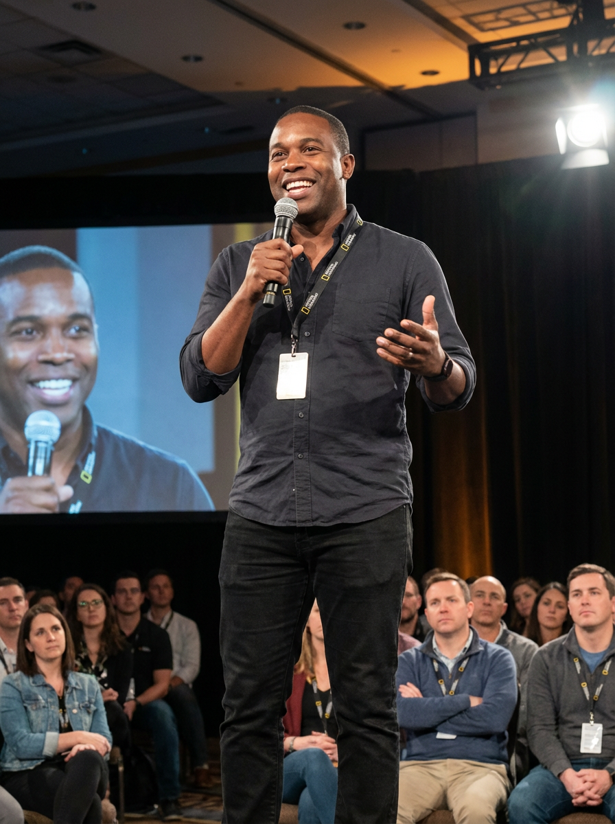 inspirational speaker model holding microphone with lanyard around his neck