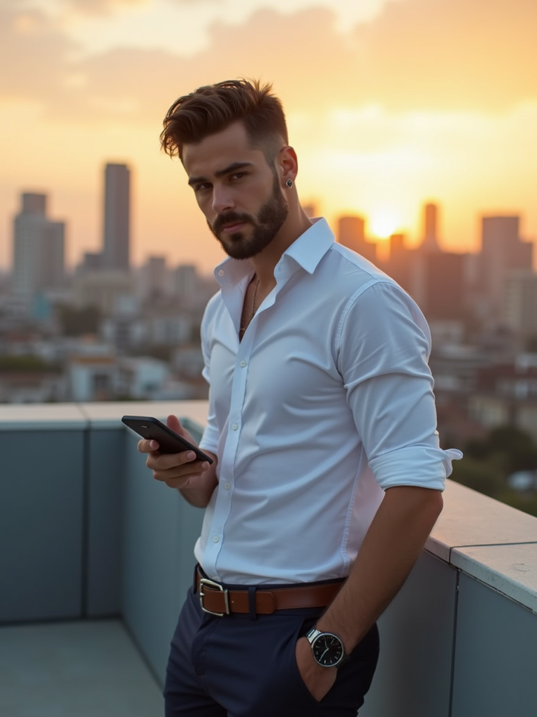 inspiring model wearing premium casual shirt with designer watch with smartphone, urban rooftop meeting space, skyline background, sunset lighting